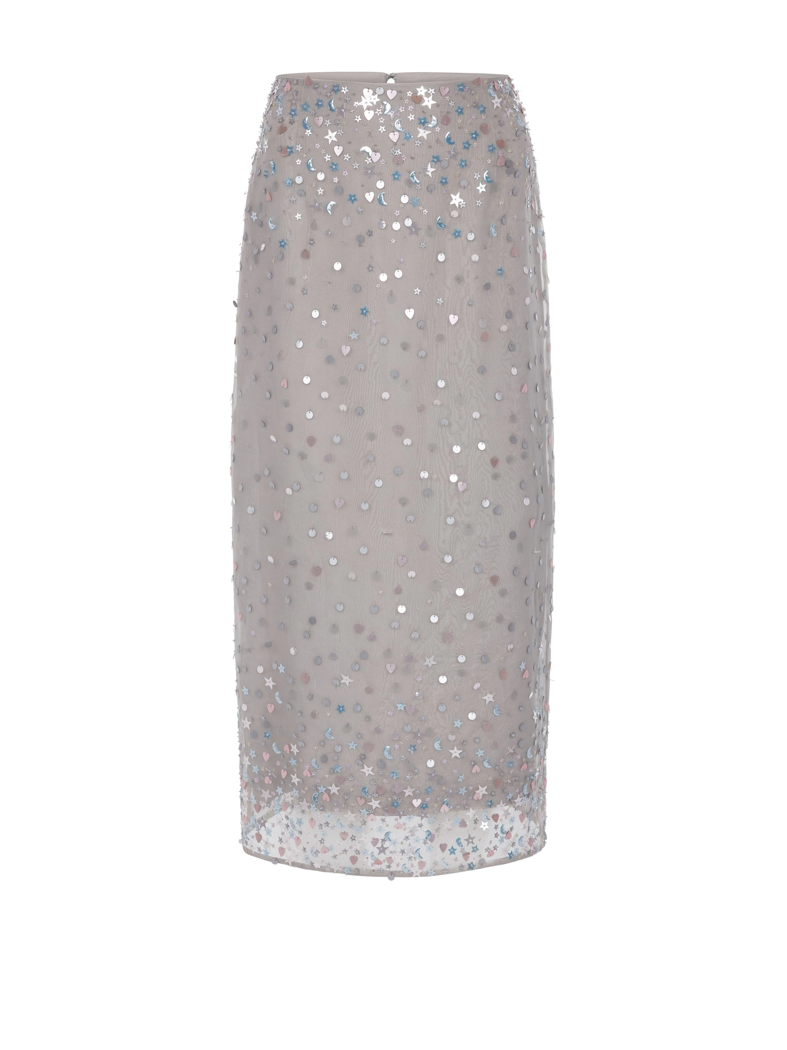 Introducing Skirt Roxane Embroidered — a playful midi silhouette brought to life with our stardust embroidery on soft grey. Designed to catch the light with every movement, it’s a fun piece that balances ease with a touch of whimsy. Product information Charlotte is 168cm / 5'6" and wears size EU34. Aster is 176 cm / 5’9” and wears size EU36. Skirt Roxane Embroidered is fully lined and fits true to size. For size inquiries, please e-mail sales@bernadetteantwerp.com Fabrics from Italy Made and hand-embroidered in India 100% SE / LINING: 100% VI