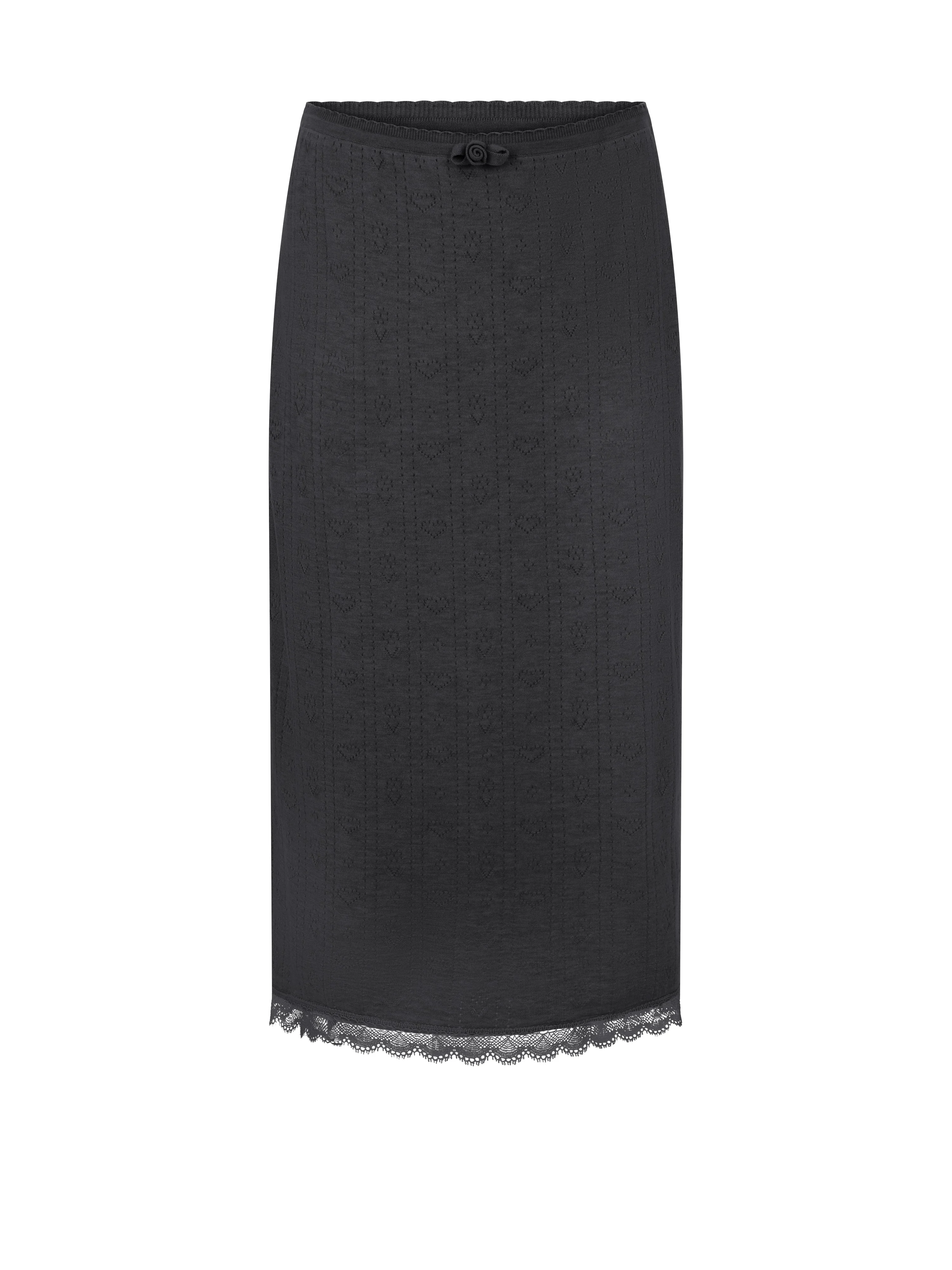 Skirt Taylor comes in a grey melange silk cashmere knit, cut to a midi length. Finished with delicate pointelle, lace trim, and a tiny rose detail in front. Best paired with Henley Hunter in grey. Product information Charlotte is 168 cm / 5'6" and wears size XS. Tumbush is 173 cm / 5’8” and wears size S. Skirt Taylor is fully lined and fits true to size. Take your usual size. For size inquiries, e-mail sales@bernadetteantwerp.com. Made in Belgium 70% SE 20% WO 10% WS / LINING: 100% PL
