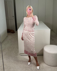 Skirt Taylor comes in Red on Vanilla Polka to Heart print. Crafted in soft silk cashmere knit and cut to a midi length, it’s finished with delicate pointelle, lace trim, and a tiny rose detail in front. Best paired with Henley Hunter or top Alba. Product information Charlotte is 168 cm / 5'6" and wears size XS. Aster is 176 cm / 5’9” and wears size S. Tumbush is 173 cm / 5’8” and wears size S. Skirt Taylor is fully lined and fits true to size. Take your usual size. For size inquiries, e-mail sales@bernadetteantwerp.com. Made in Belgium 70% SE 20% WO 10% WS / LINING: 100% PL