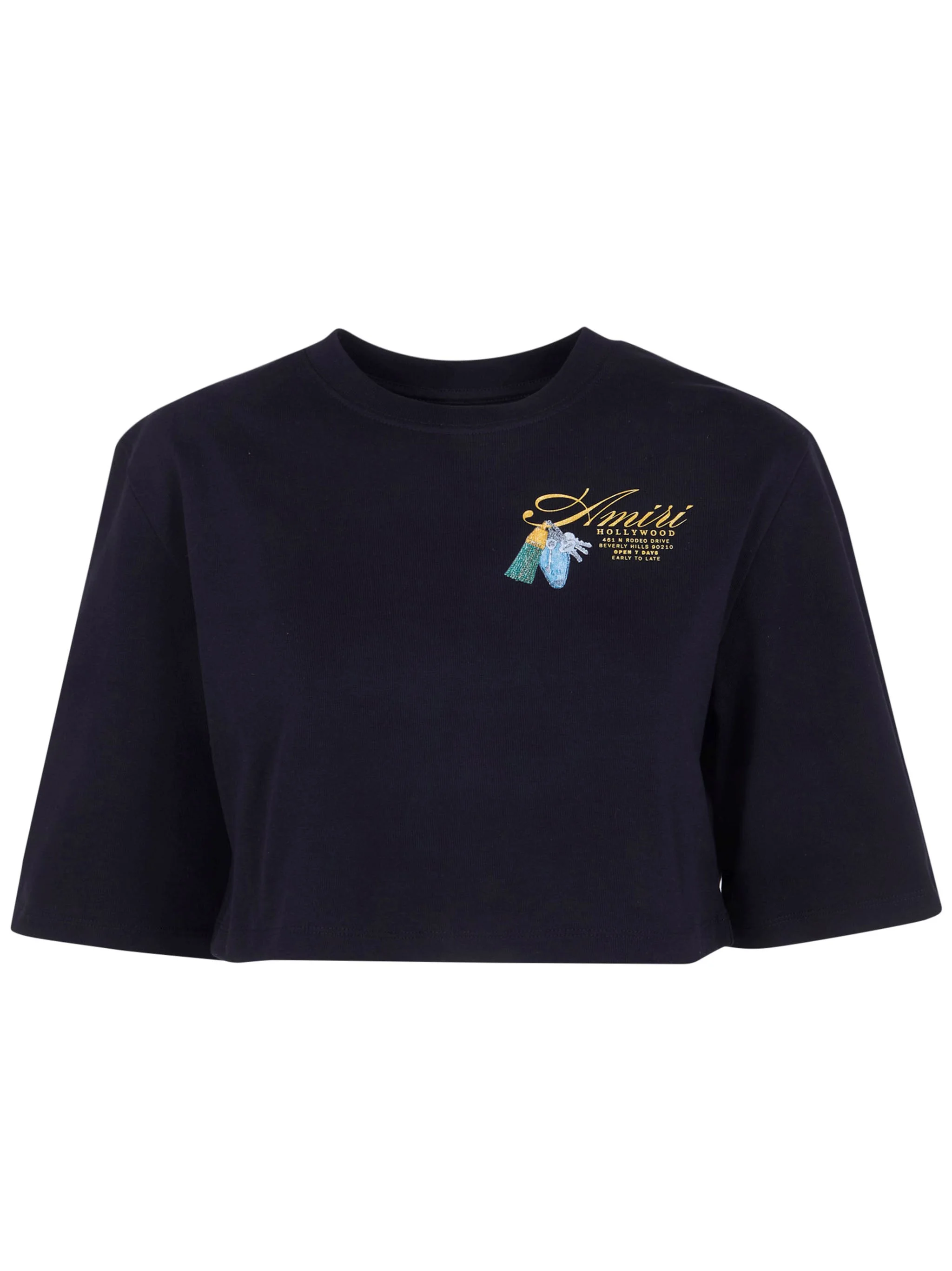 Introducing the 'CHATEAU KEYS' CROPPED TEE from AMIRI, a stunning addition to your wardrobe that embodies contemporary style. Crafted from 100% premium cotton, this black tee offers both comfort and durability. Made in Portugal, it reflects exceptional craftsmanship, with a cropped design that accentuates the silhouette. Ideal for casual outings or urban adventures, pair it with high-waisted jeans or layered under a blazer for a chic look. The unique logo detail adds a touch of exclusivity, making it perfect for those who appreciate luxury fashion. Embrace a versatile staple that speaks to your individuality.. MadeIn: Portugal PT Product code: AWTOJR1053 BLACK