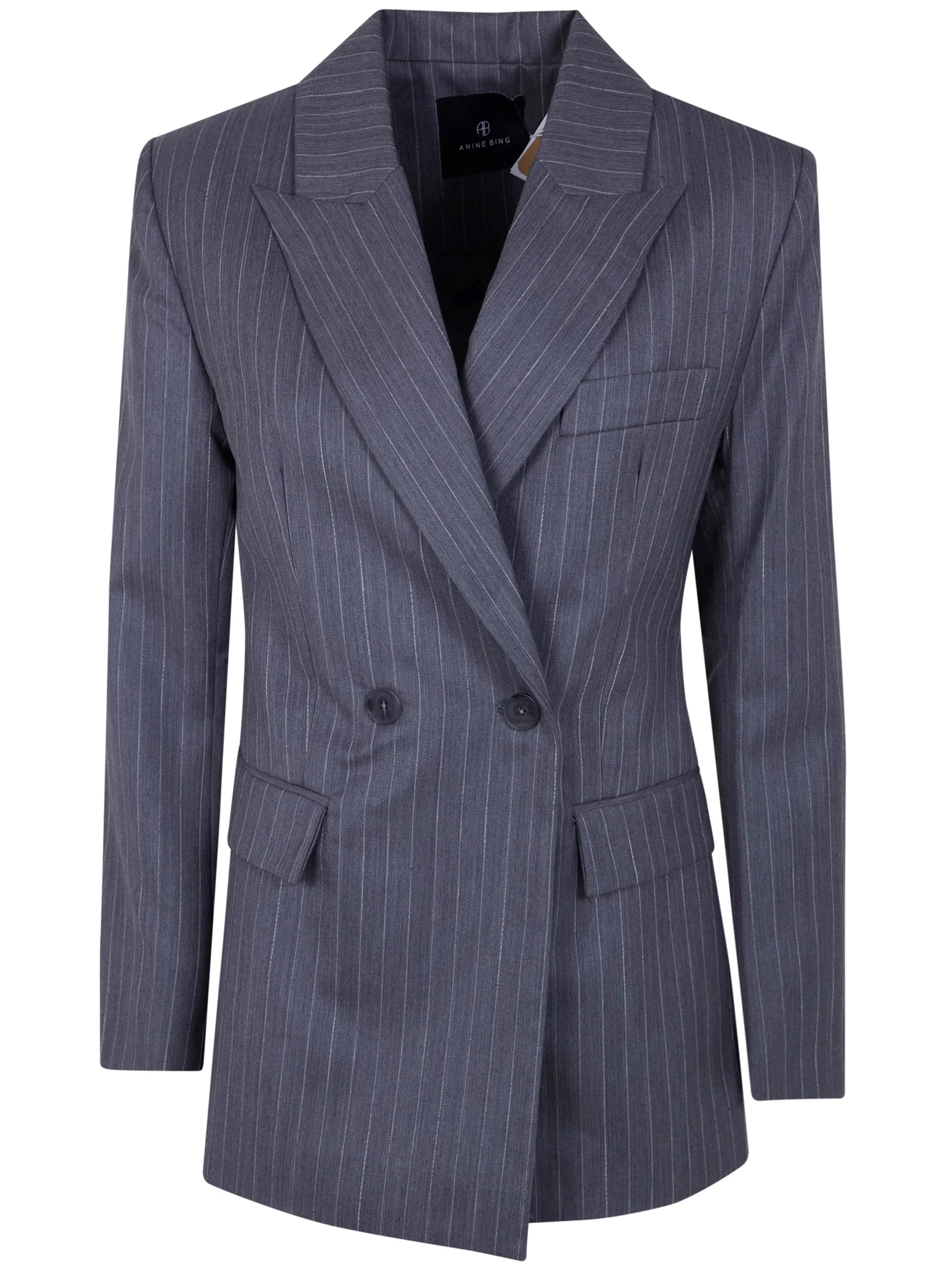 "TIPHAINE" BLAZER by ANINE BING is a sophisticated jacket that embodies elegance and contemporary style. Crafted from high-quality cotton, this light grey pinstripe blazer offers a refined touch to any outfit. Made in Bulgaria, it showcases impeccable craftsmanship. Ideal for both casual and formal occasions, it effortlessly elevates your wardrobe. Pair it with tailored trousers for a chic office look or with jeans for a more relaxed vibe. The blazer's unique design features striking pinstripes and a tailored silhouette, making it a versatile staple. Embrace sustainability with this exquisite piece that combines luxury with conscious fashion.. MadeIn: Bulgaria BG Product code: A.01.12173.STR17 LIGHT GREY PINSTRIPE