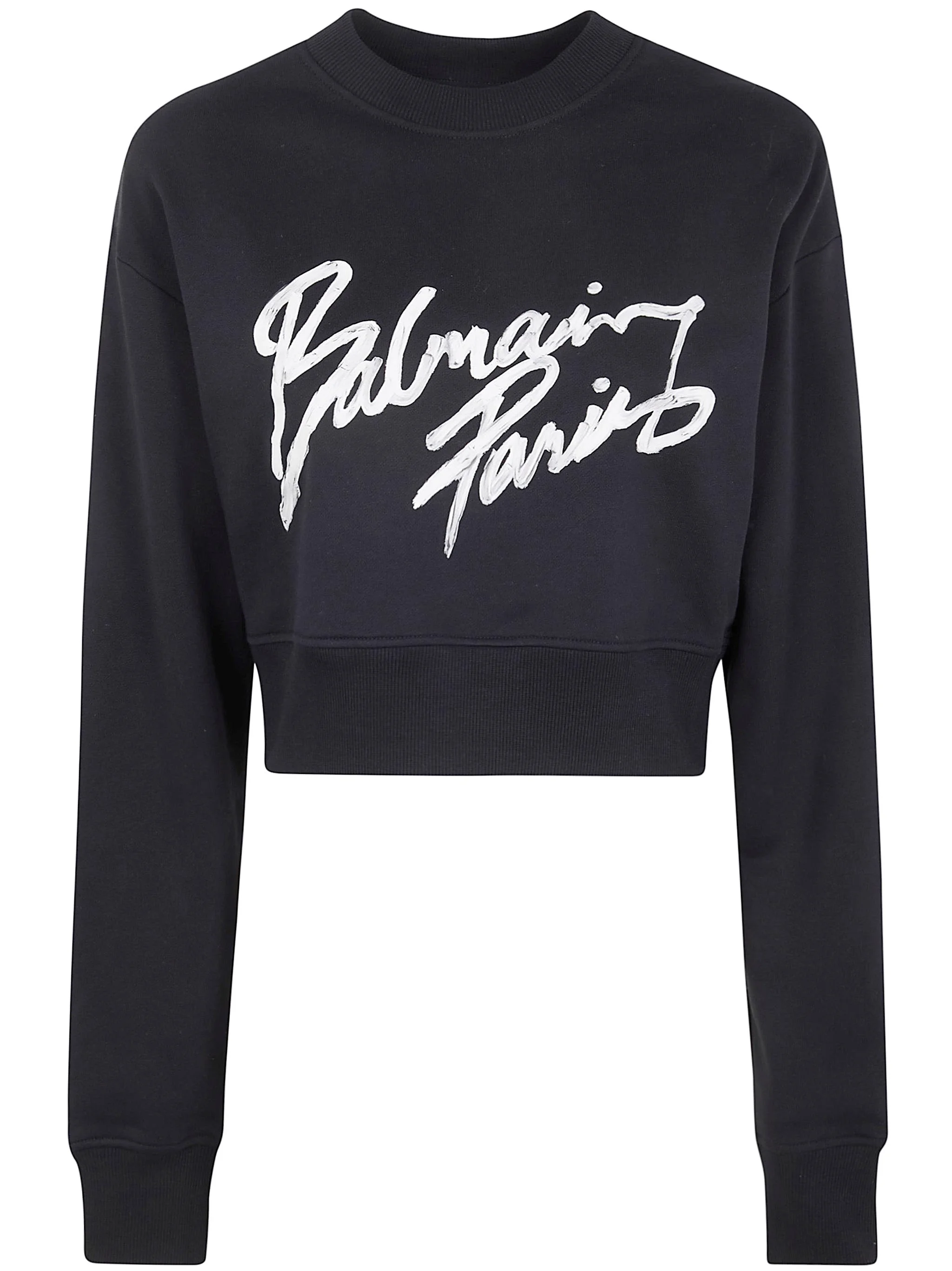 Introducing the "BALMAIN PARIS" CROPPED ROUNDNECK SWEATER, an exquisite addition to any wardrobe by the renowned brand BALMAIN. Crafted from 100% organic cotton, this luxurious black sweater is designed for comfort and style. Made in Portugal, it embodies a commitment to sustainability while providing a perfect fit. Pair it with high-waisted trousers or a chic skirt for a sophisticated look at brunch or an evening out. The unique cropped design and round neckline add a modern twist, making it versatile enough for various occasions. Elevate your fashion game with this must-have piece. Product code: GF1JO080BD41 EAB BLACK WHITE