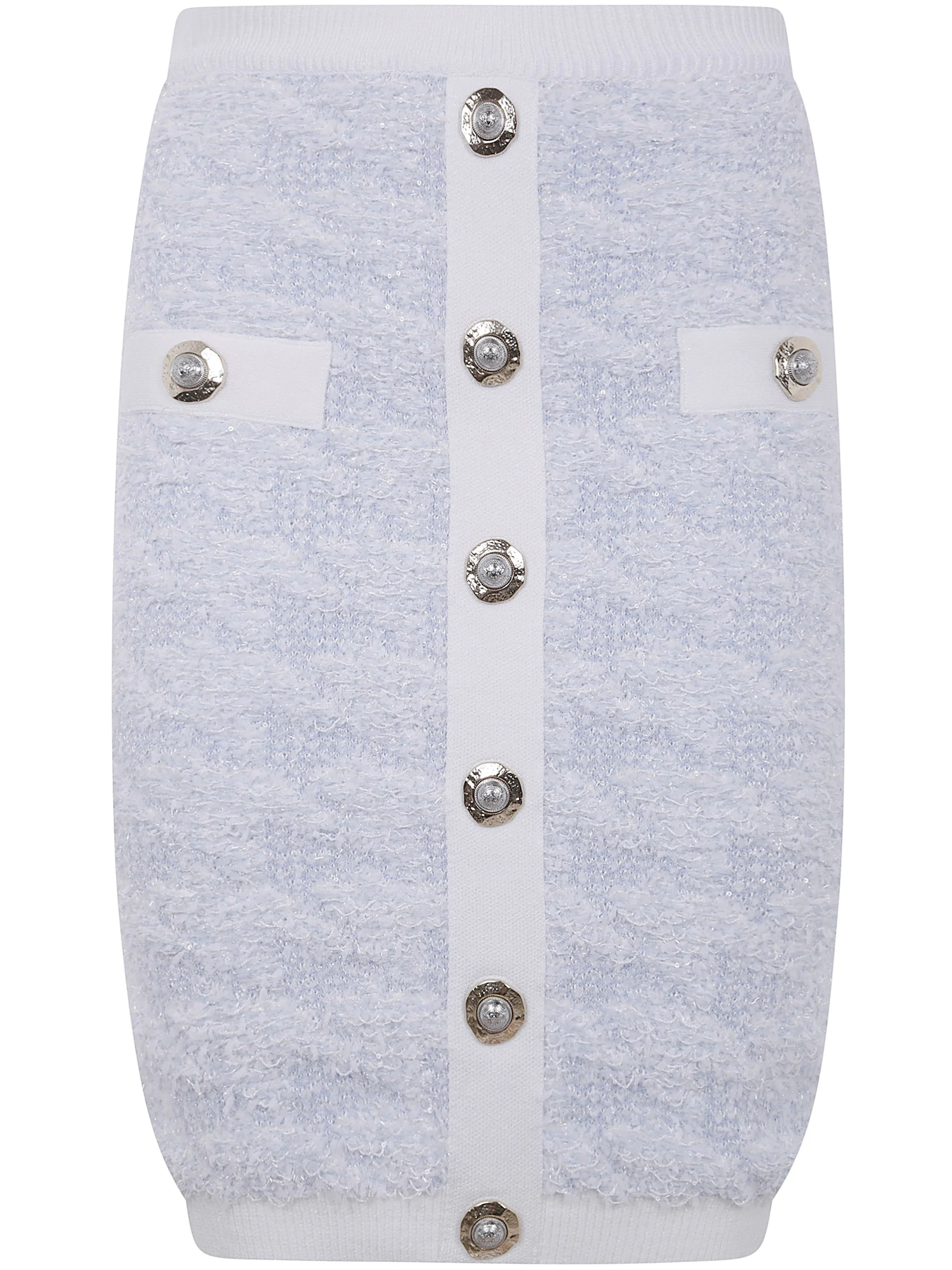 The Buttoned Tweed Knee Length Skirt by Balmain is a stunning addition to your wardrobe. Crafted from high-quality tweed, this skirt features a sophisticated blue hue that exudes elegance. Made in France, it combines luxurious materials with expert craftsmanship. Ideal for formal events or stylish outings, it pairs beautifully with tailored blouses or chic tops. Elevate your look with this timeless piece that embodies both style and versatility, designed to make you feel unique and confident. Product code: FF1LC016KI72 SOM BLUE WHITE