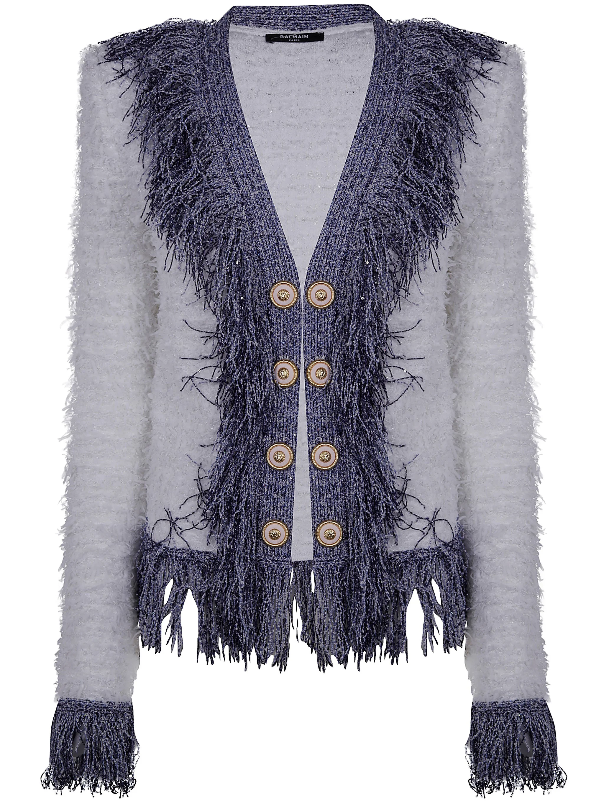 The Collarless Glittered Fringed Tweed JKT by Balmain is a stunning addition to the women's jacket collection. This piece is crafted from luxurious tweed featuring glitter accents, exuding sophistication. Available in a timeless white color, this jacket is made in France. Perfect for both day and evening wear, it can elevate any outfit, making it ideal for formal events or upscale gatherings. Emphasizing elegance, this jacket showcases unique fringed details that create movement and interest. Its exclusive design ensures you stand out while embodying contemporary chic. Product code: EF1SK049KH97 GEH WHITE BLUE JEANS