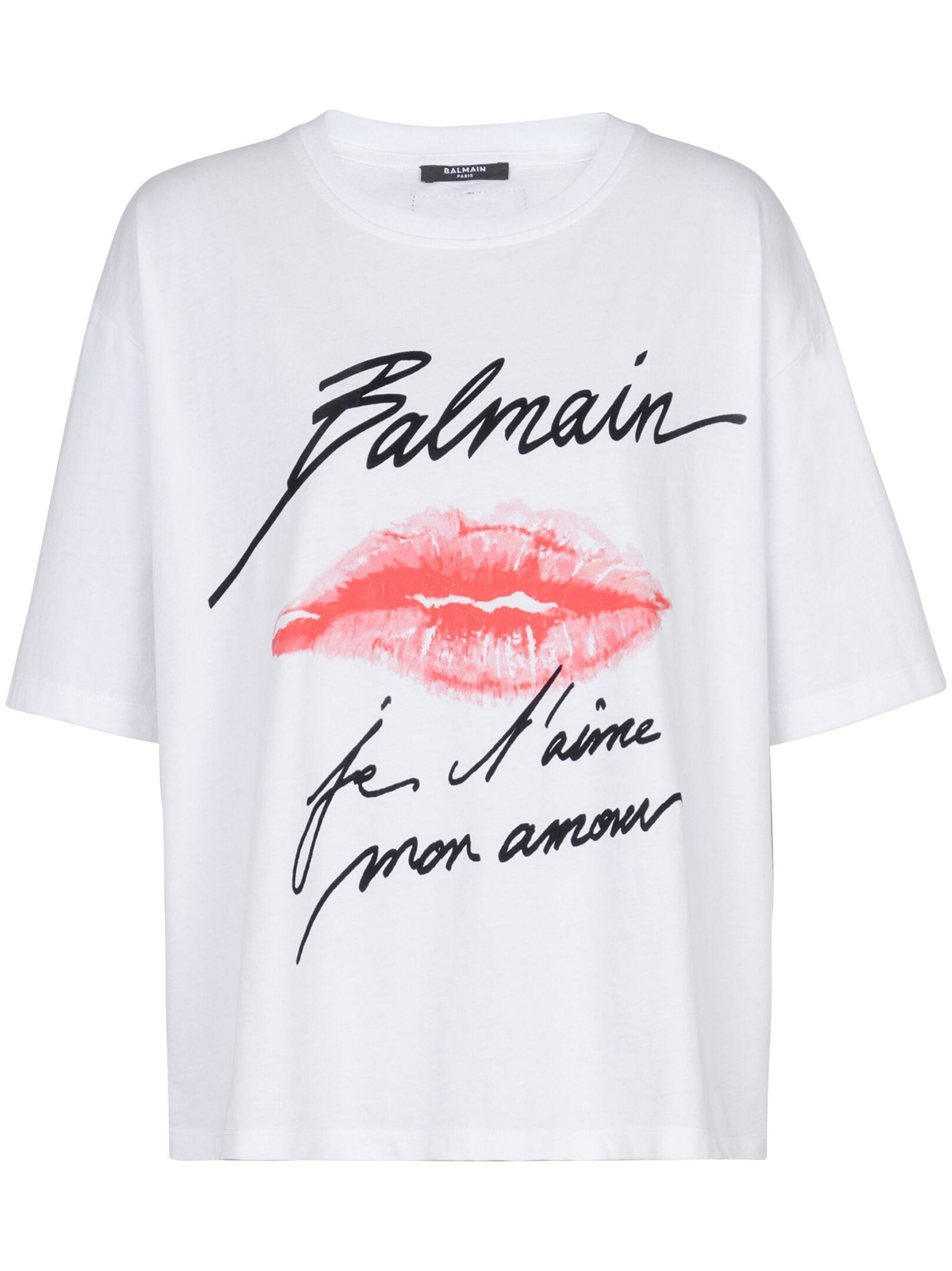 The SS BALMAIN KISS PRINT T-SHIRT is a striking piece from the renowned brand BALMAIN, perfect for making a statement in your wardrobe. Crafted from high-quality cotton, this t-shirt features a bold white base adorned with a playful red lips print, embodying contemporary design. Made in Portugal, it offers both comfort and style. With its relaxed fit, this t-shirt is versatile enough for casual outings or laid-back gatherings. Pair it with jeans or shorts for an effortlessly chic look. Embrace the luxury of BALMAIN while enjoying the sustainability of ethically sourced materials. Product code: EF1EG110GE45 GQV WHITE BLACK RED