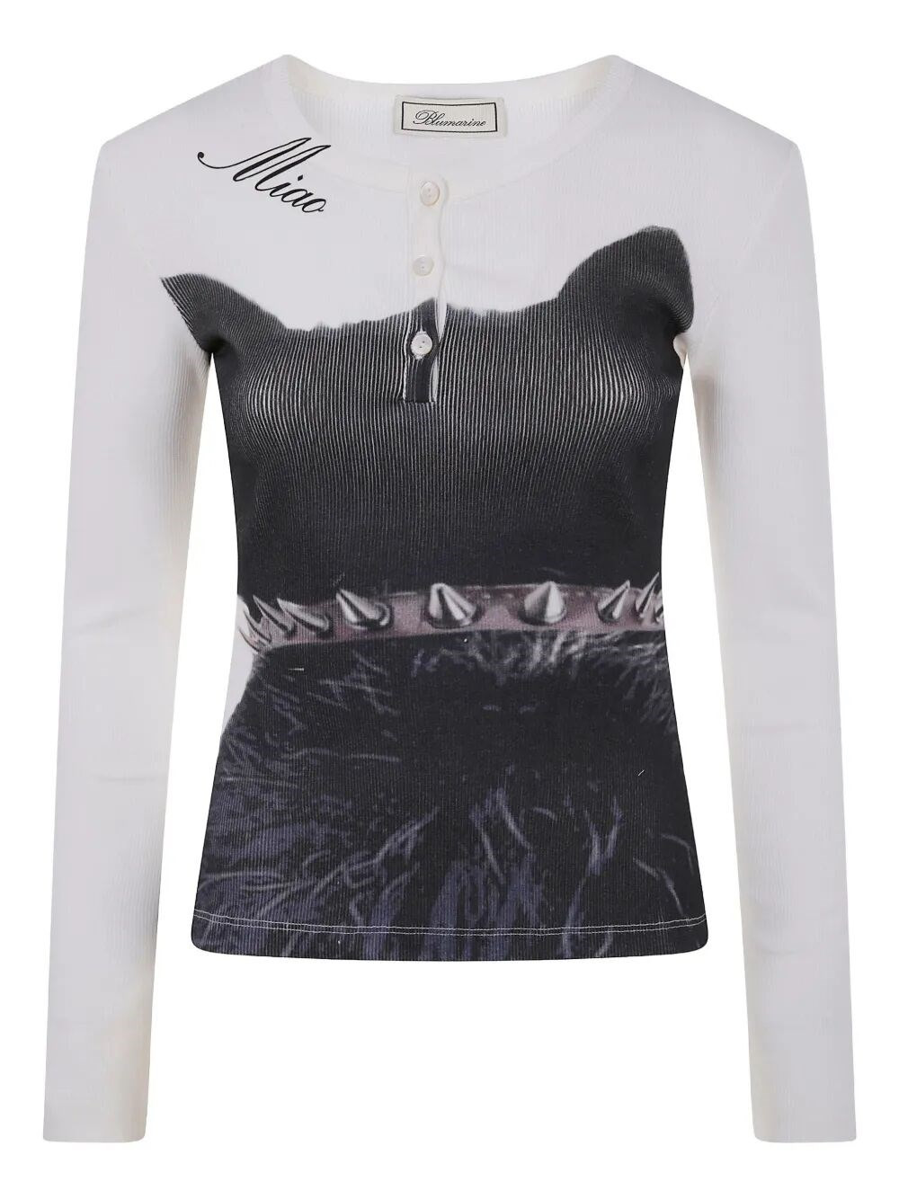 The Ribbed Jersey T-Shirt by Blumarine is a stunning piece that combines comfort and style. Crafted from high-quality materials, this white t-shirt features a unique cat design that adds a playful touch. Made in Turkey, it offers a perfect fit for various body types. Ideal for casual outings or relaxed gatherings, this versatile piece can elevate any outfit. Pair it with jeans or skirts for a chic look. Embrace a blend of craftsmanship and contemporary design in your wardrobe with this exquisite t-shirt, perfect for those who appreciate fine fashion. Product code: A522T100A C1039 NATURAL WHITHE BLACK