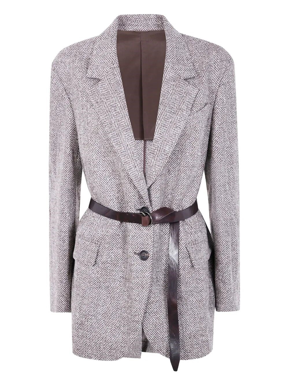 Wool and alpaca houndstooth blazer with leather belt and monili
