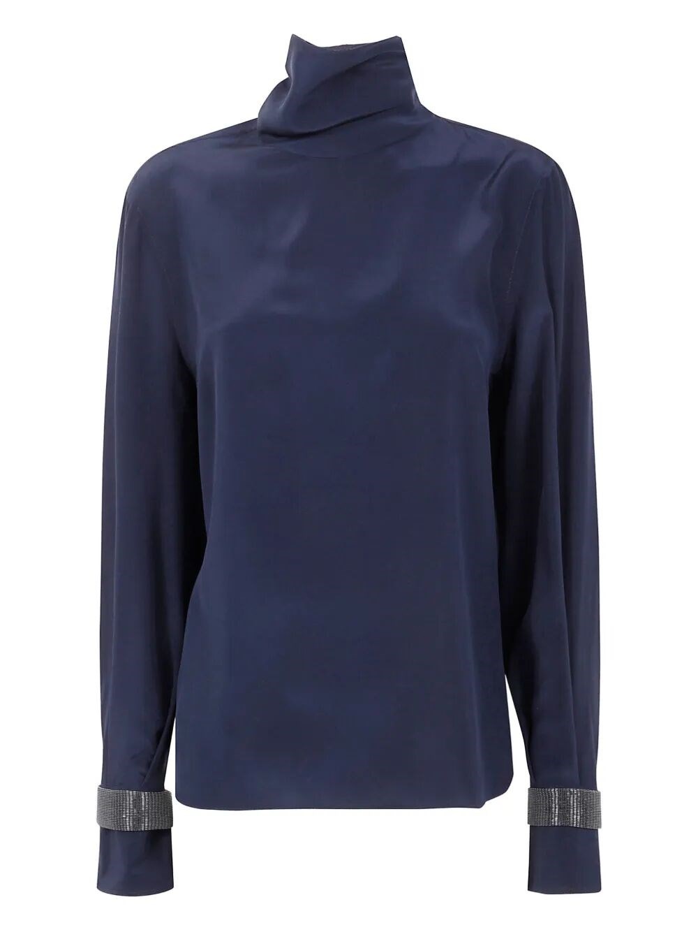 Bead-embellished silk crepe de chine turtleneck blouse Navy