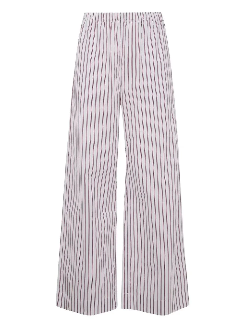 Introducing the "CABELLO" WIDE LEG TROUSERS by BY MALENE BIRGER, a stunning addition to your wardrobe. Crafted from 100% organic cotton, these trousers boast a rich brown hue adorned with striking red and white stripes, offering a perfect blend of comfort and style. Made in China, they exemplify sustainable fashion practices. Ideal for both casual outings and sophisticated events, pair them with a fitted top for an effortlessly chic look. Let your style shine with this exclusive piece that embodies artisanal quality and attention to detail.. MadeIn: China CN Product code: 104026 QG7 CABERNET STRIPE