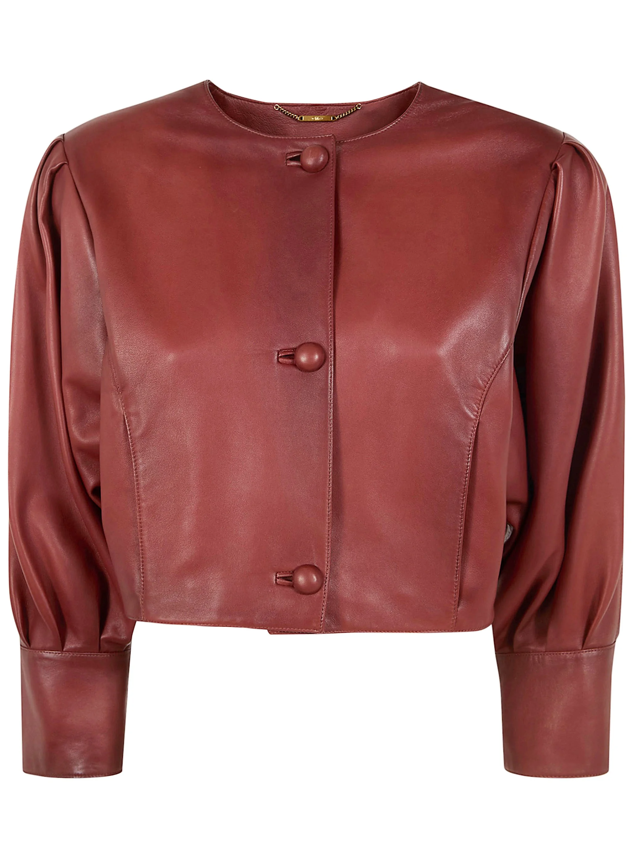 Introducing the 'CROPPED LEATHER ROUND NECK JACKET' by CHLOE, a stunning addition to your wardrobe. Crafted from 100% domestic lamb leather, this exquisite jacket radiates sophistication with its rich brown hue. Made in Italy, it showcases unparalleled craftsmanship. With a tailored fit, it effortlessly complements both casual and formal outfits. Ideal for evening outings or chic daytime looks, this jacket exudes elegance and versatility. Its unique design features a cropped silhouette and distinct button details, making it a statement piece that enhances your individuality.. MadeIn: Italy IT Product code: CH26SCV97201 642 BURNT HENNA