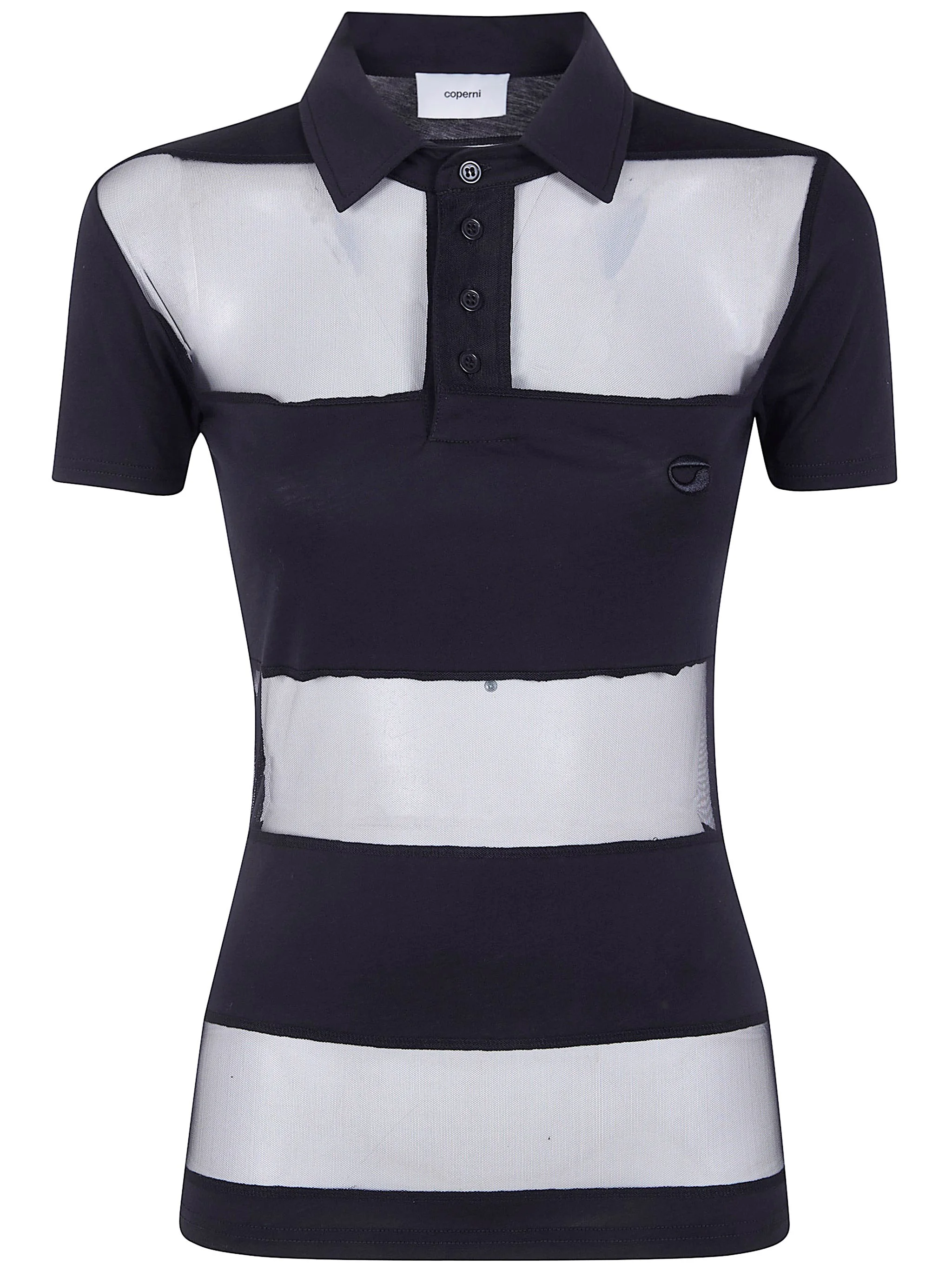 Introducing the exquisite "STRIPED SHEER" POLO TOP by COPERNI, a must-have addition to your spring/summer wardrobe. This chic top, crafted from a luxurious blend of 50% cotton, 41% polyamide, and 9% elastane, offers a delightful balance of comfort and style in a timeless black hue. Proudly made in Portugal, its sheer design features unique striped detailing that elevates any outfit. Perfect for both casual outings and sophisticated events, this versatile piece pairs beautifully with tailored trousers or a sleek skirt. Embrace elegance and sustainability with this exclusive design that reflects fine craftsmanship and attention to detail.. MadeIn: Portugal PT Product code: COPJS115F5028 BLK BLACK