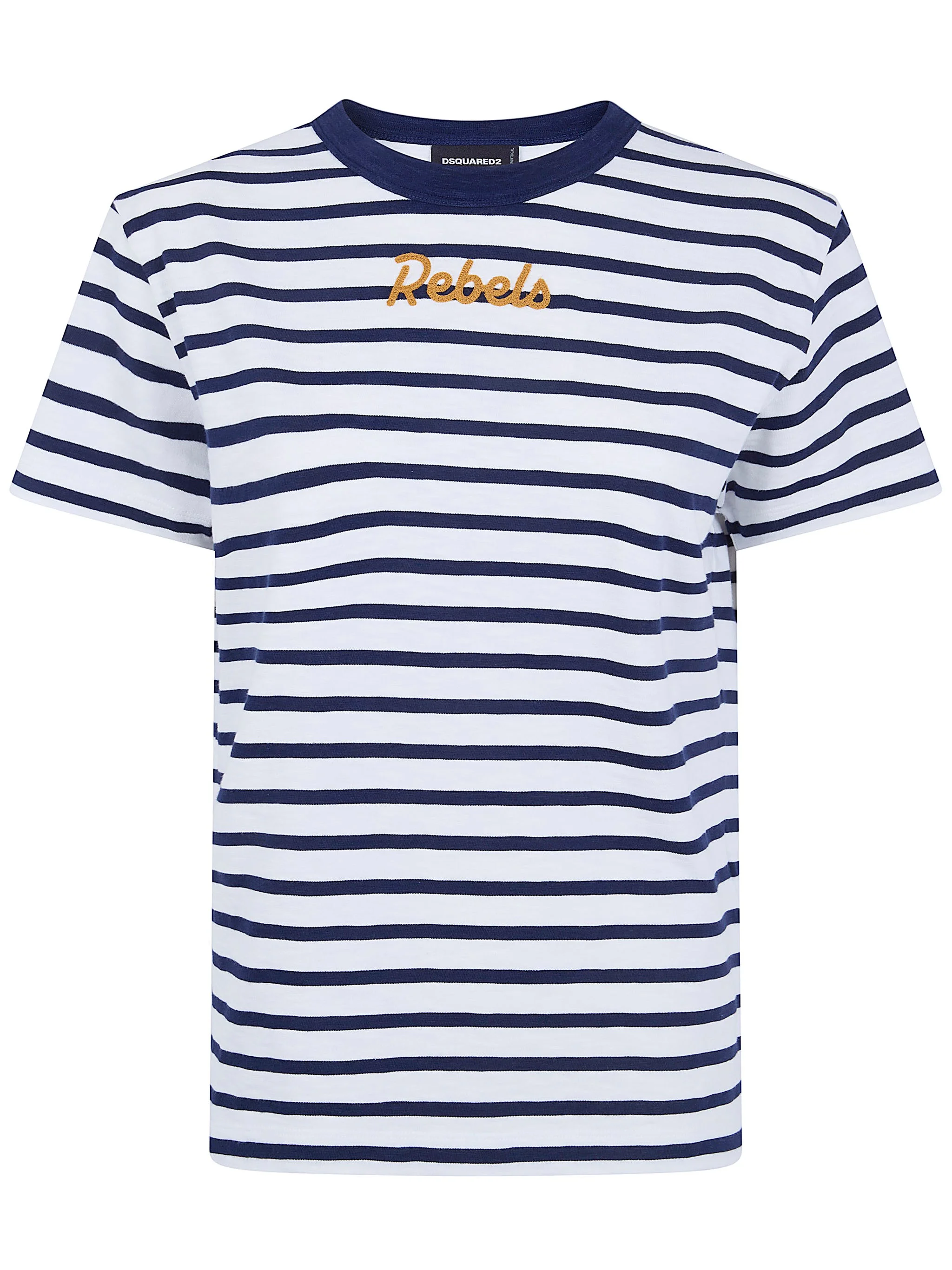 Introducing the "STRIPED JUST RIGHT" FIT T-SHIRT by DSQUARED2, a standout piece in the t-shirt category. Crafted from 100% premium cotton, this shirt boasts a fresh White hue adorned with striking navy and blue stripes. Made in Italy, it reflects meticulous craftsmanship and attention to detail. Ideal for casual outings or laid-back weekends, this versatile t-shirt pairs beautifully with denim and sneakers. With its unique design and quality materials, it embodies modern sophistication, making it a must-have for the contemporary wardrobe. Product code: S75GD0515.D20107 001F WHITE BLUE NAVY