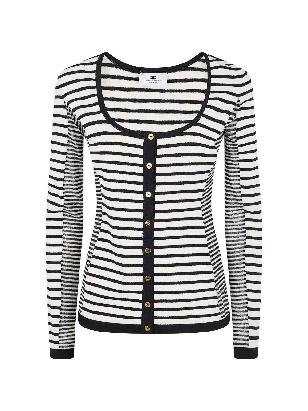 Introducing the 'TRICOT SQUARED NECK SWEATER' by ELISABETTA FRANCHI, a luxurious addition to your spring-summer wardrobe. Crafted from a sumptuous blend of 56% Viscose, 33% Polyamide, and 11% Cotton, this black sweater exudes elegance. Made in Italy, it showcases impeccable craftsmanship. Its squared neckline and unique striped design elevate any outfit, making it perfect for both casual outings and sophisticated events. Pair it with tailored trousers for a chic office look or with denim for a relaxed weekend vibe. Sustainable fashion meets timeless style in this exclusive piece, designed for the modern woman who values quality and sophistication.. MadeIn: Italy IT Product code: MK04T61E2 685 BLACK BUTTER