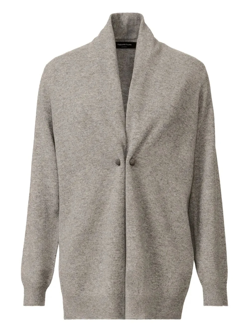 The 'CARDIGAN' by FABIANA FILIPPI is a luxurious sweater crafted from a sumptuous blend of 75% virgin wool, 15% silk, and 10% cashmere. In a sophisticated gray hue, this piece epitomizes Italian craftsmanship with its exquisite design and attention to detail. Ideal for layering during the Fall Winter 2025/2026 season, it combines elegance with functionality. Wear it over a tailored blouse for a chic office look or pair it with denim for a casual outing. Experience the exclusivity of sustainable fashion with this exceptional garment, designed to make you feel unique and valued.. MadeIn: Italy IT Product code: MAD215F059.L517 8132 ROCK