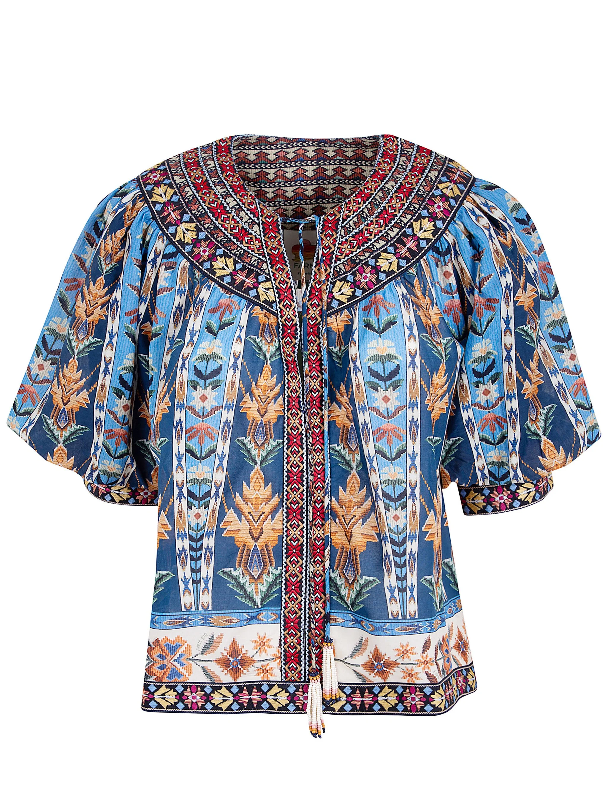Blue Embroidered Tapestry Tassels Puff Sleeve Blouse