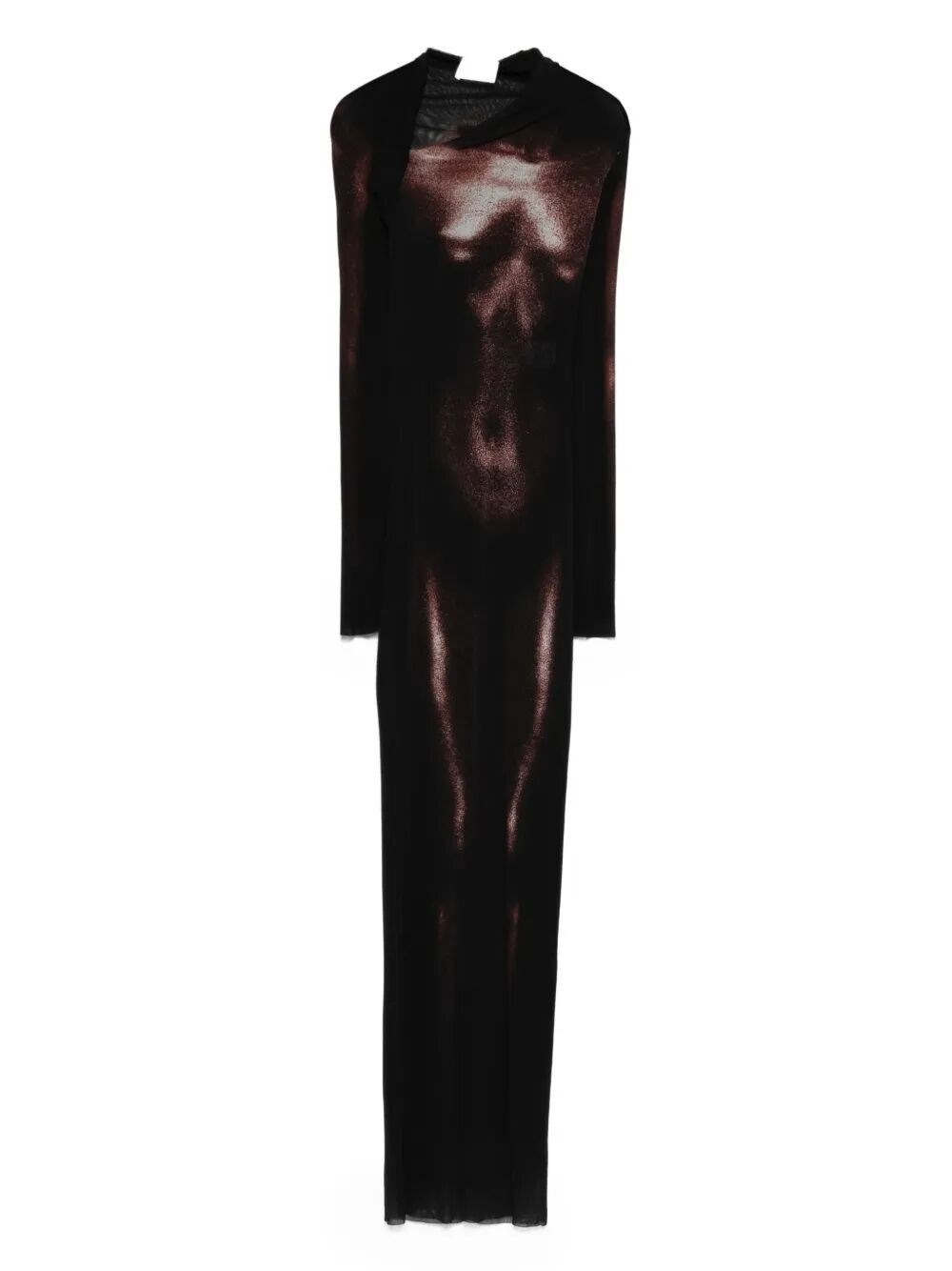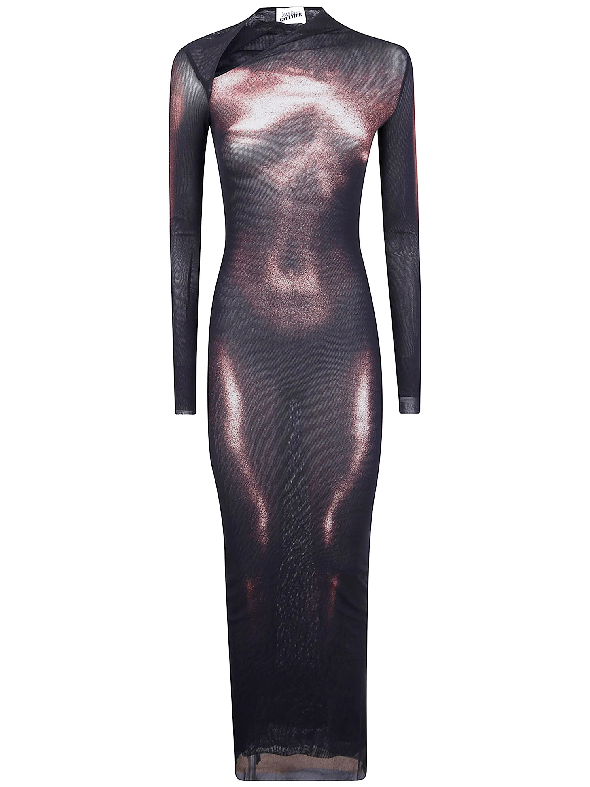 The MESH ASYMETRIC COLLAR LONG DRESS PRINTED "BODY DUST" by JEAN PAUL GAULTIER represents a bold statement in the realm of women's fashion. Crafted from high-quality materials, this striking black dress features an avant-garde asymmetrical collar design that enhances its unique silhouette. Made in Italy, it combines luxury with artistry. Ideal for evening events or sophisticated gatherings, this dress allows for creative styling with accessories. Its exclusive design and attention to detail make it a must-have for those seeking to express individuality and elegance. Product code: 25.04.W.DR051.M010P 0060 BLACK BROWN