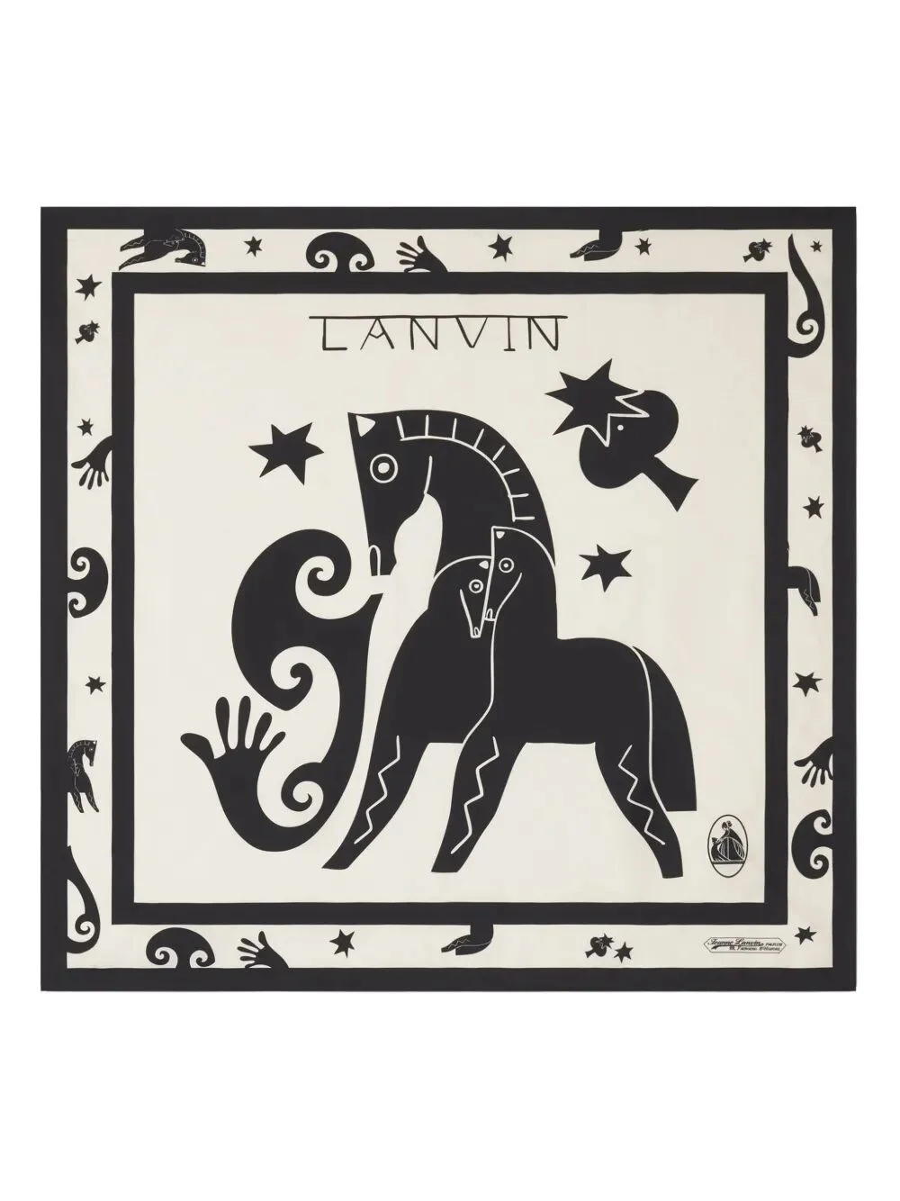 Introducing the 'HORSE' FOULARD 90x90, a luxurious scarf from the renowned brand LANVIN. Crafted from 100% silk, this exquisite accessory features a stunning white hue that exudes elegance. Made in Italy, it measures 90x90 cm, making it a versatile piece for any wardrobe. The intricate design showcases unique details that elevate its sophistication. Ideal for special occasions or to add a touch of refinement to everyday outfits, this foulard embodies exclusivity. Embrace the artisanal quality and timeless appeal of this limited-edition piece, perfect for those who appreciate the finer things in life.. MadeIn: Italy IT Product code: AW.SARFO1.1SLN.P26 0210 ECRU BLACK
