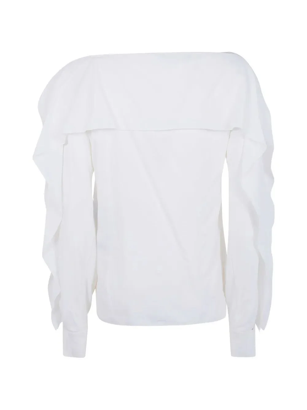 Introducing the 'LONG SLEEVES TOP WITH RUFFLES' from LANVIN, a stunning addition to your wardrobe. Crafted from a luxurious blend of 70% viscose and 30% silk, this exquisite white top is made in France, ensuring the highest quality. The unique ruffled design adds a touch of sophistication, making it perfect for both casual outings and elegant events. Pair it with tailored trousers for a chic look or with a flowing skirt for a romantic evening. Embrace exclusivity with this limited edition piece that highlights artisanal craftsmanship and sustainable fashion principles, allowing you to express your individuality with style.. MadeIn: France FR Product code: RW.TO0010.6253.P26 021 CREAM