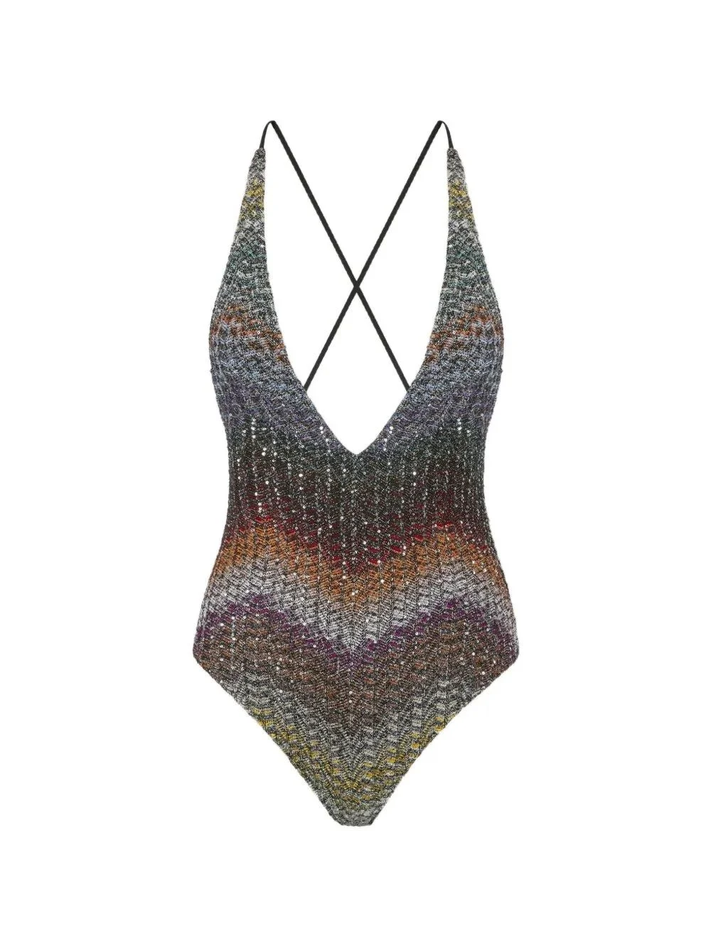 One-piece V-neck swimsuit in a Greek-style zigzag knit with sequins