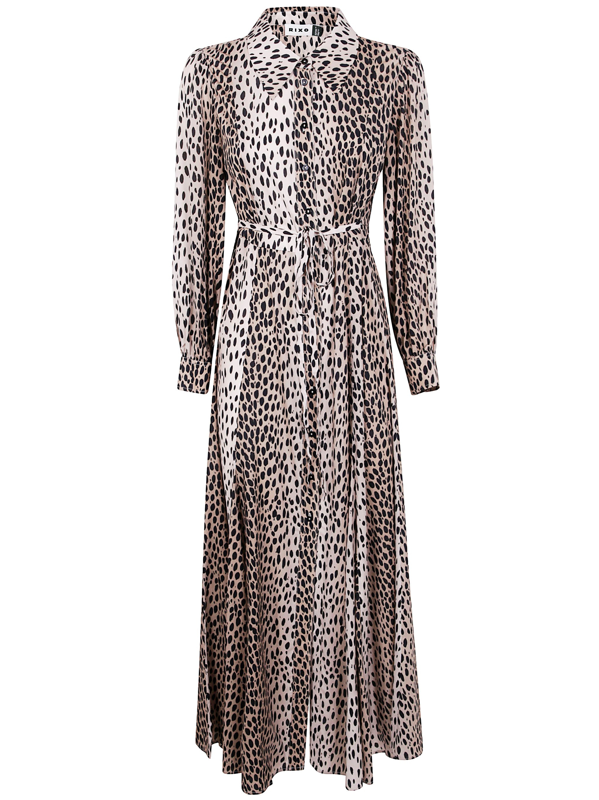 Introducing the "MADDISON" DRESS ANTELOPE SPOT BLACK by RIXO, a stunning addition to your fall wardrobe. Crafted from high-quality materials, this dress features a chic black color adorned with an elegant antelope spot pattern. Made in China, it epitomizes both style and comfort. Ideal for special occasions or evening outings, the dress's unique design and attention to detail ensure you stand out. Pair it with your favorite heels for a sophisticated look. Experience the luxury of fashion that values sustainability and craftsmanship. Product code: 010.00341.424.06046 ANTELOPE SPOT BLACK