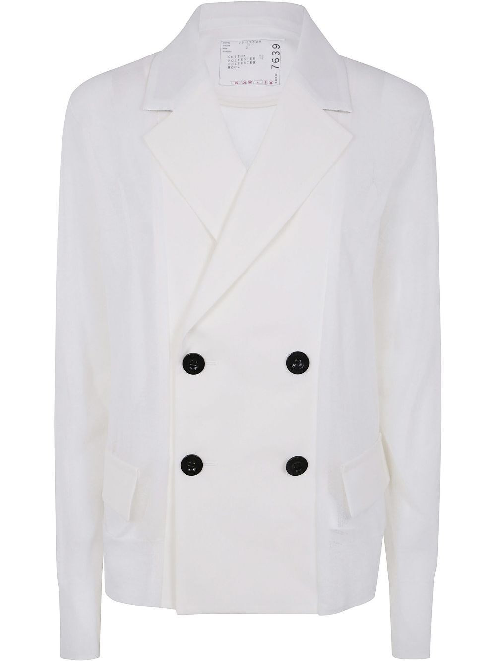 The Suiting X Knit Jacket by Sacai is a refined addition to your spring summer wardrobe. Crafted from premium materials, this jacket features a stunning white color that exudes sophistication. Made in Japan, it showcases meticulous attention to detail and innovative design elements. Ideal for both casual outings and more formal occasions, this versatile piece can be paired effortlessly with tailored trousers or relaxed jeans. The unique blend of fabrics not only enhances comfort but also ensures a distinctive silhouette, making it a must-have for those who appreciate high-quality craftsmanship. Product code: 25.07639 151 OFF WHITE