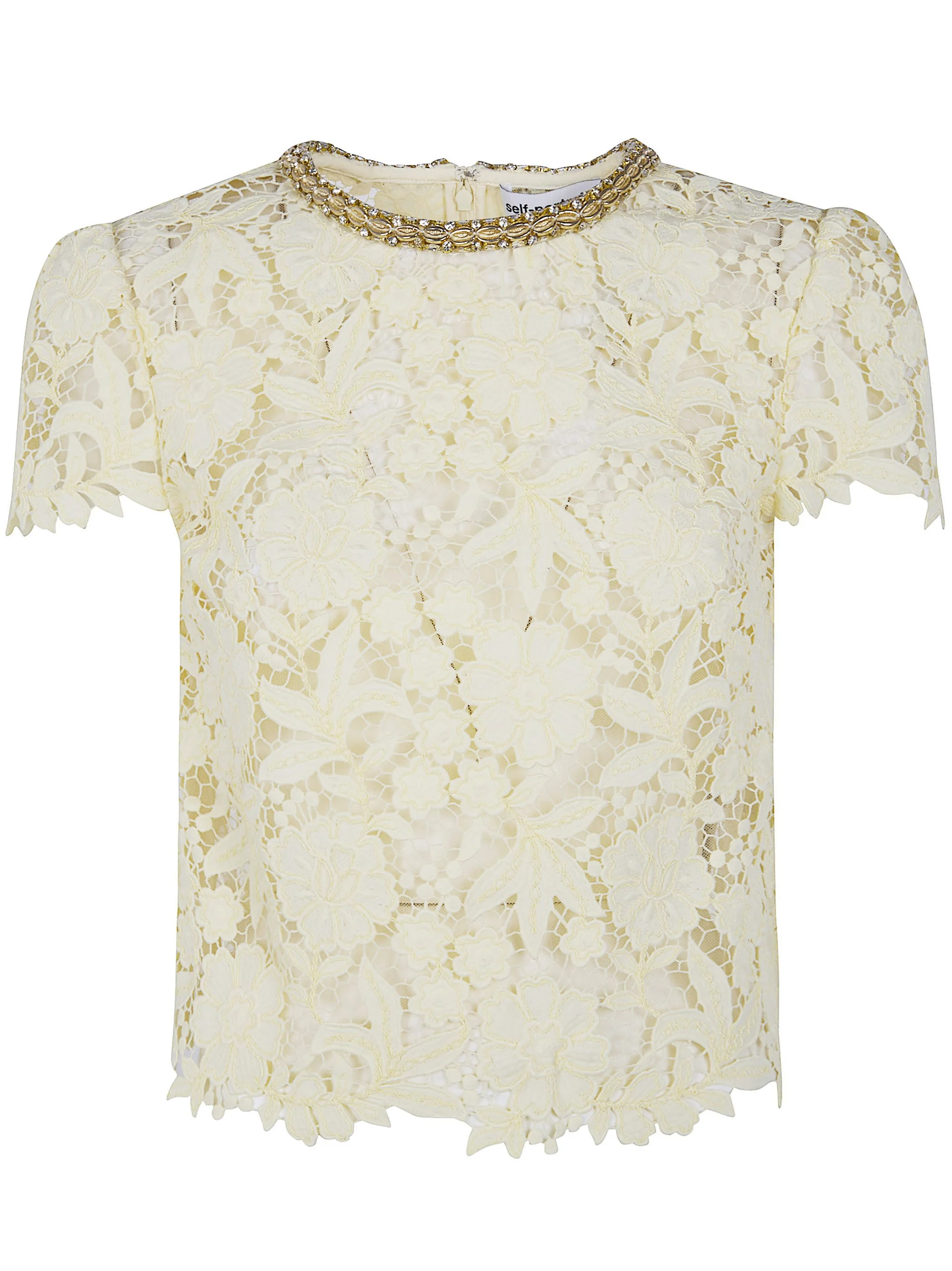 Introducing the YELLOW LACE TOP by SELF-PORTRAIT, a stunning addition to your spring-summer wardrobe. This exquisite top is crafted from 100% polyester, ensuring a lightweight and breathable feel perfect for warm days. Its vibrant yellow hue radiates positivity and joy, making it a standout piece for any occasion. Made in China, this top features intricate lace detailing, adding a touch of elegance to its contemporary design. Ideal for garden parties or brunch dates, pair it with tailored trousers or a flowing skirt for a sophisticated look. Embrace the luxury of artisanal craftsmanship and let your style shine with this exclusive piece.. MadeIn: China CN Product code: SS26.096TA YELLOW