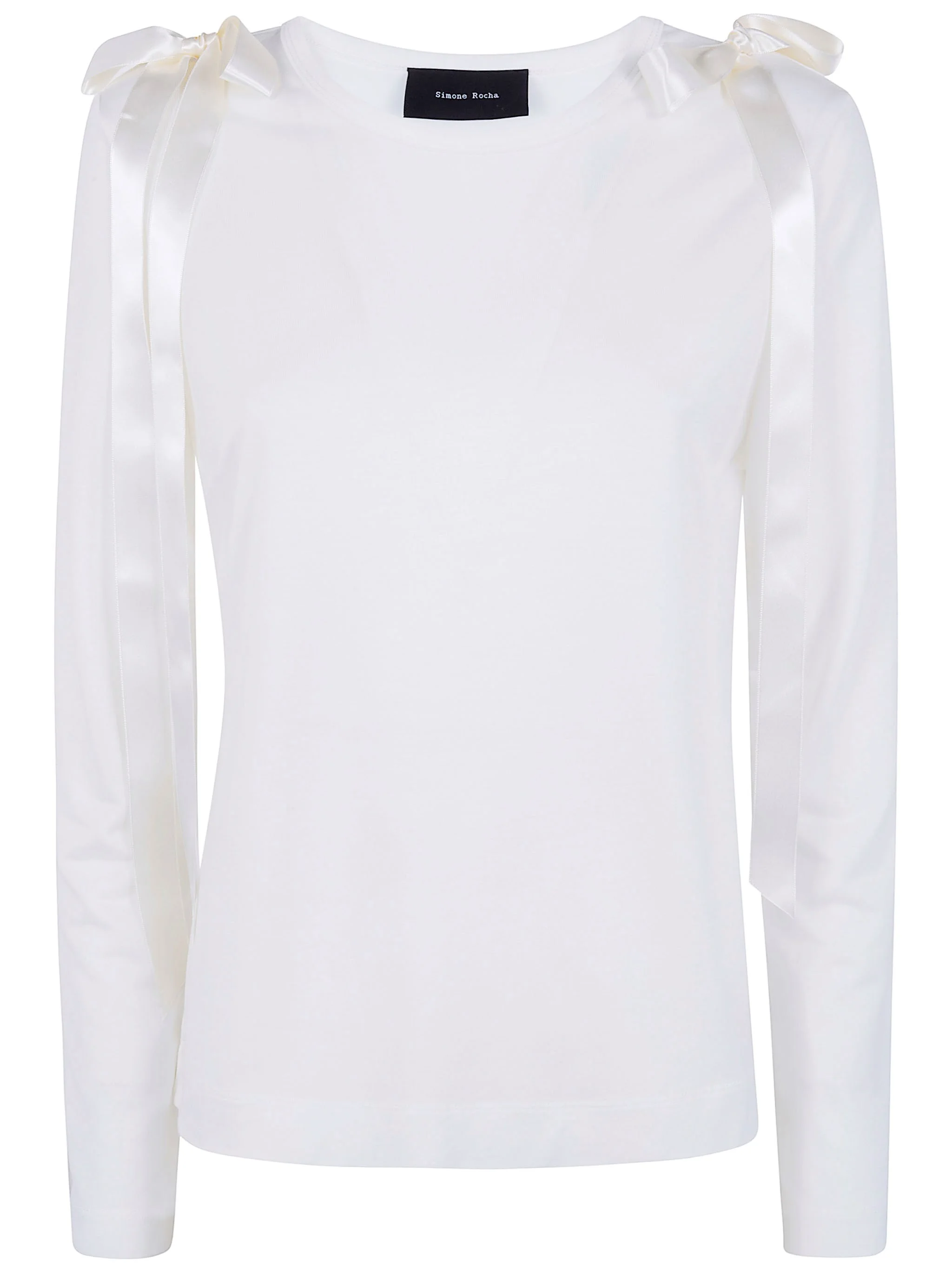 The 'BOW RIBBON TAIL' LONG SLEEVE T-SHIRT by SIMONE ROCHA is a stunning addition to your wardrobe. Crafted from 100% Lyocell, this white t-shirt epitomizes luxury and sustainability, made in Portugal. Its elegant design features a unique bow ribbon detail that adds a playful yet sophisticated touch. Perfect for both casual outings and special occasions, it effortlessly elevates your style. Pair it with tailored trousers for a chic office look or with denim for a laid-back weekend vibe. Experience the blend of craftsmanship and modernity with this exclusive piece.. MadeIn: Portugal PT Product code: 5367.0571 IVORY