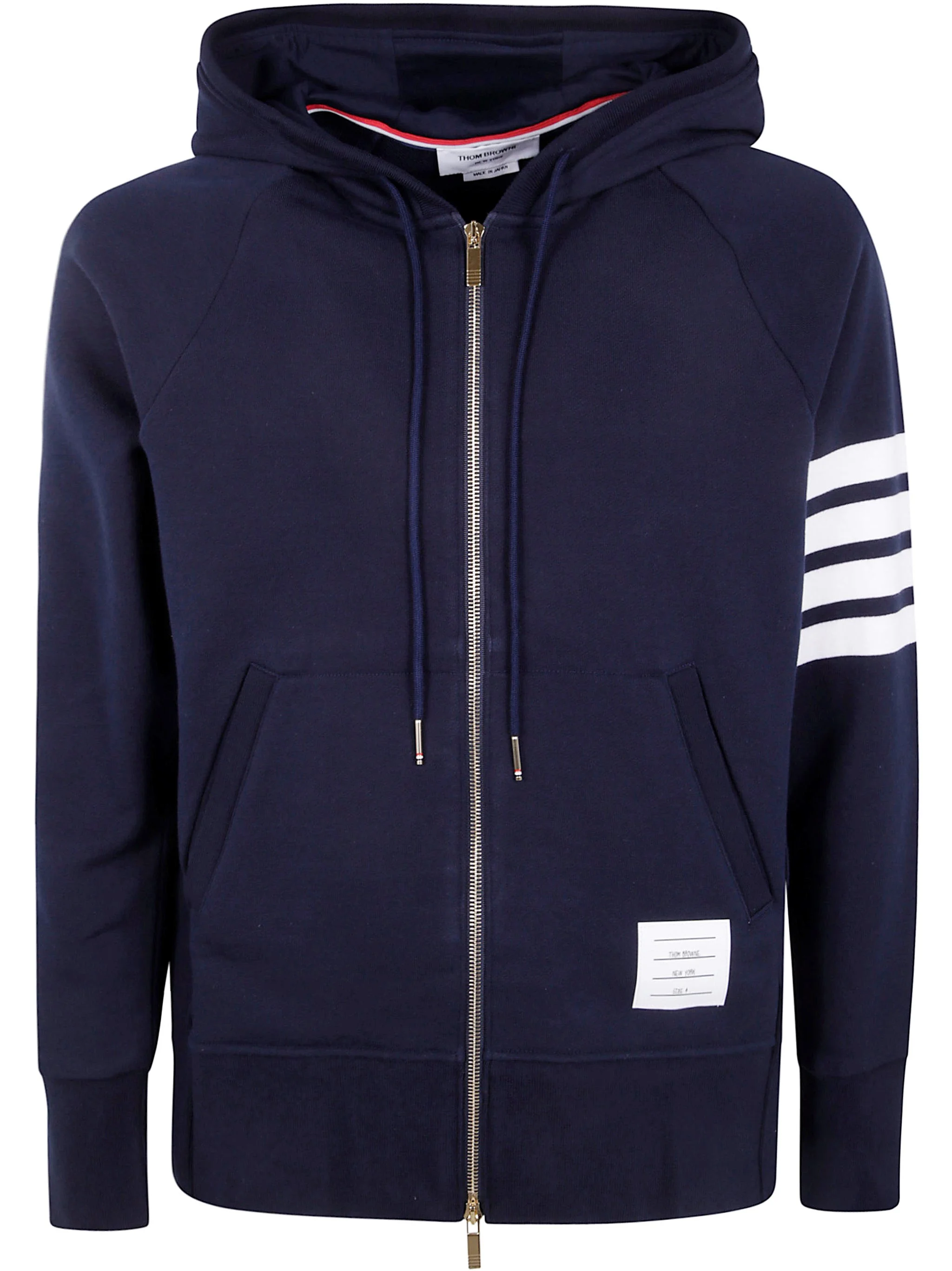Introducing the 'CLASSIC FULL ZIP HOODIE IN CLASSIC LOOPBACK WITH ENGINEERED 4 BAR' by THOM BROWNE, a timeless piece in the sweatshirt category. Crafted from 100% premium cotton, this exquisite blue hoodie embodies luxury and comfort. Made in Japan, it showcases impeccable craftsmanship and attention to detail. Ideal for layering, it's perfect for both casual outings and sophisticated gatherings. Embrace its unique design featuring the iconic 4-bar stripe, making a bold statement wherever you go. Elevate your wardrobe with this exclusive, sustainable piece that speaks to the modern man's refined taste. Product code: MJT022H.00535 098 461 NAVY