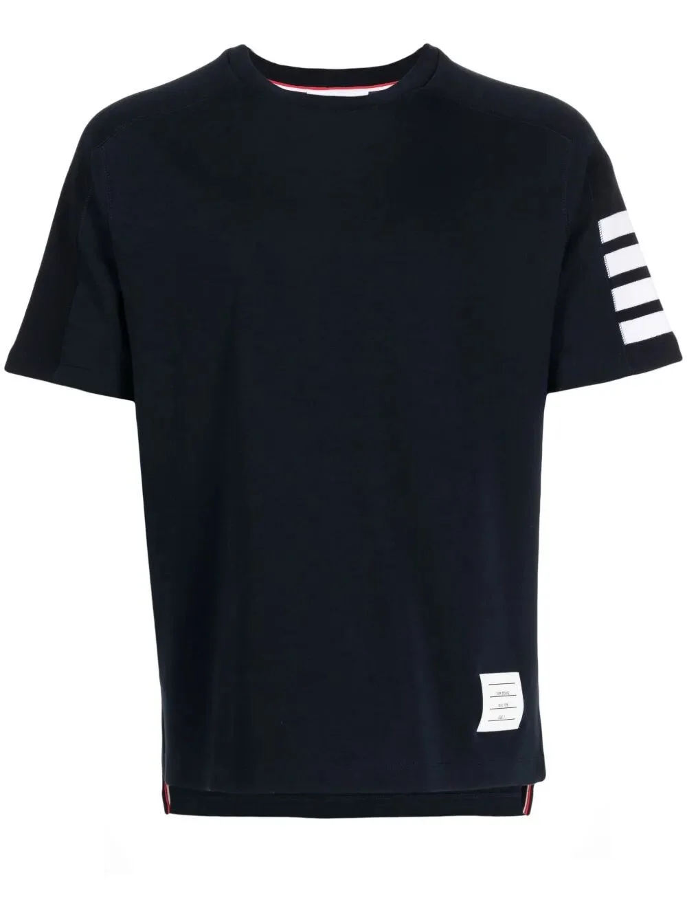 Introducing the 'SHORT SLEEVE TEE WITH 4 BAR STRIPE IN MILANO COTTON' by THOM BROWNE, a refined addition to your wardrobe. Crafted from 100% Milano cotton, this blue tee exemplifies luxurious comfort and durability, made in Japan. With its unique four-bar stripe design, this shirt is perfect for both casual outings and sophisticated events. Pair it with tailored trousers for a polished look or denim for a relaxed vibe. This exclusive piece highlights artisanal craftsmanship and attention to detail, making it a must-have for the contemporary gentleman who values style and quality. Product code: MJS246A.07323!098 415 NAVY