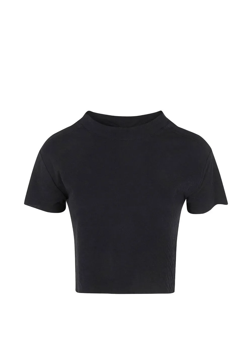 Introducing the 'CROP T-SHIRT' by THOM KROM, a chic addition to your wardrobe. Crafted from 100% premium cotton, this black t-shirt is designed for ultimate comfort and breathability, perfect for the warm seasons. Made in Turkey, it offers a sleek, modern silhouette that flatters every body type. Embrace its unique cropped design, ideal for layering or wearing alone for an effortlessly stylish look. Perfect for casual outings or a night out, pair it with high-waisted jeans or a skirt. This piece exemplifies contemporary fashion and is a must-have for those who appreciate quality and sophistication.. MadeIn: Turkey TR Product code: WTS619 BLACK