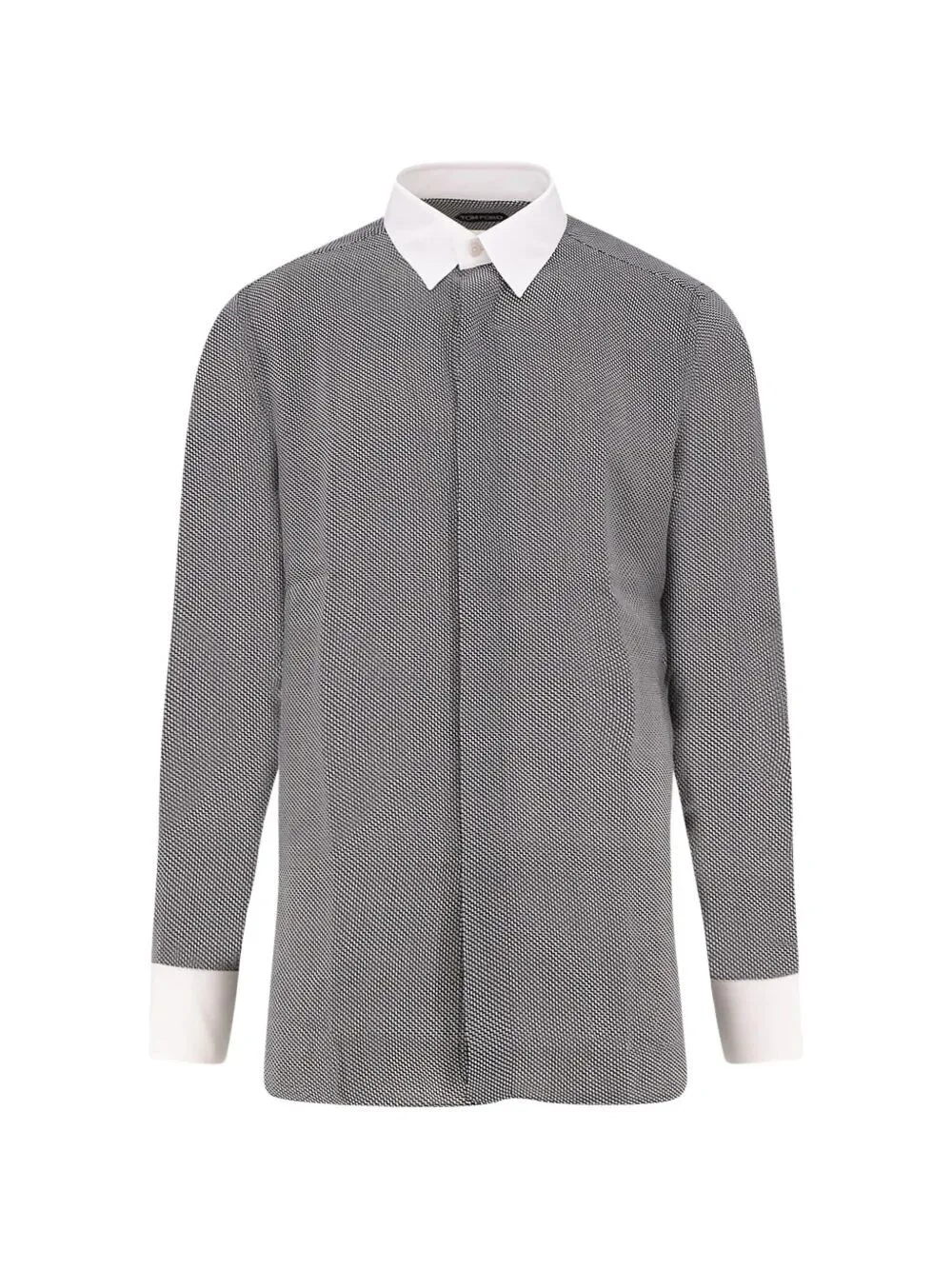 Introducing the 'GRAPHIC SHARKSKIN PRINT NEW FLUID COLLARE AND CUFF CONTRAST SHIRT' by TOM FORD, a stunning addition to your wardrobe. Crafted from 100% luxurious silk in a striking black hue, this shirt exemplifies Italian craftsmanship with its impeccable 'Made in Italy' label. The unique sharkskin print and contrasting collar and cuffs create a sophisticated design that stands out. Ideal for upscale events or a refined evening out, this shirt elevates any ensemble, ensuring you feel exceptional. Embrace the exclusivity and artistry of TOM FORD, where every detail speaks of luxury and elegance.. MadeIn: Italy IT Product code: HRBF04.S0206 BLACK & WHITE