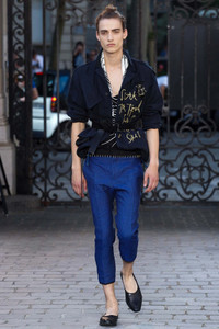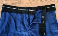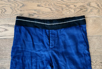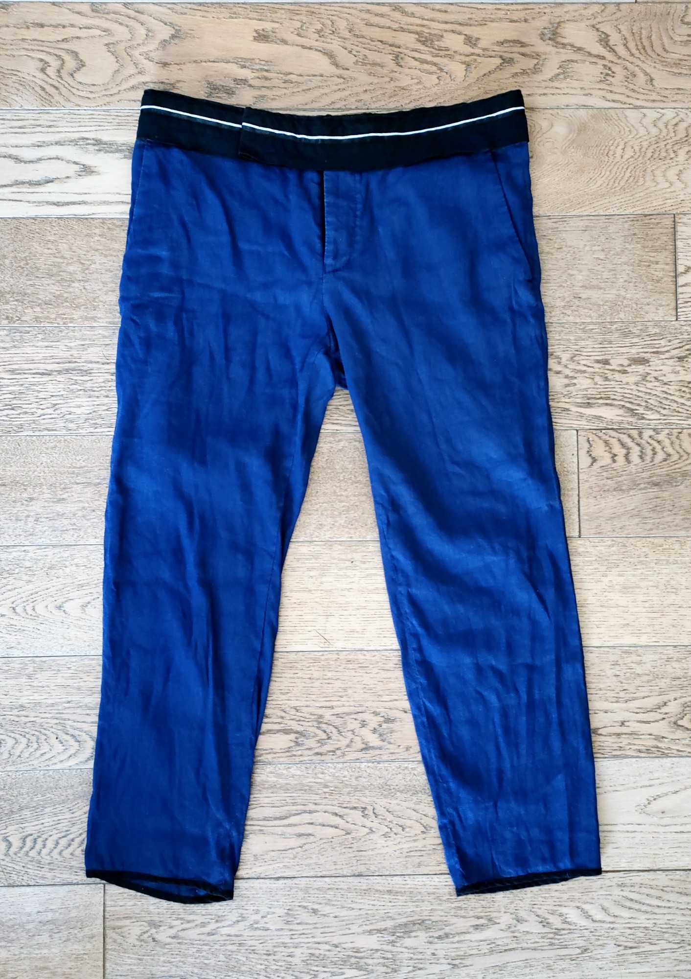 Light summer trousers in linen with a cropped fit and a contrast waistband. Beautiful blue with black finishes. As seen on the SS16 runway (different waistband detail but same model). Size 50. Great condition.