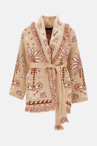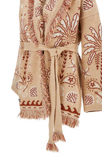 Open cardigan with belt made from cotton blend Featuring multicolor graphic print Fringe trim Shawl collar Made in Italy Details and Care Color: Multicolore Composition: 60% WO 40% CO Made in: Italia Sku: LWHB064R26KNI00361OF