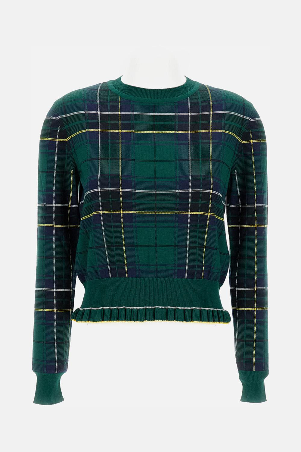 Crewneck sweater in green, blue, and yellow wool tartan. Elasticated ruffle hem. Details and Care Color: Verde Composition: 100% WO Made in: Italia Sku: 839787Q1BEL3072