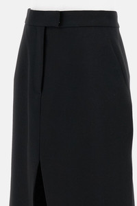 Gonna a tubino a coda di rondine in gabardine di lana stretch nera. Ampio spacco frontale, tasche laterali e silhouette svasata. Chiusura con zip a scomparsa e gancio, ha un taschino con bottone sul retro. Details and Care Color: Nero Composition: 100% WO Made in: Italia Sku: 848863QJAFK1000