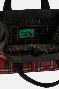 Tote bag with braided fabric handles. Material: 100% waxed cotton, tartan pattern Interior: Spacious main compartment with internal zip pocket for smaller items. Distinctive details: Embroidery with Barbour x GANNI logo Details and Care Color: Rosso Composition: 100% CO Made in: Cina Sku: LBA0462TN11 Size and Fit Altezza 35 cm, larghezza 43 cm, profondita 17 cm.