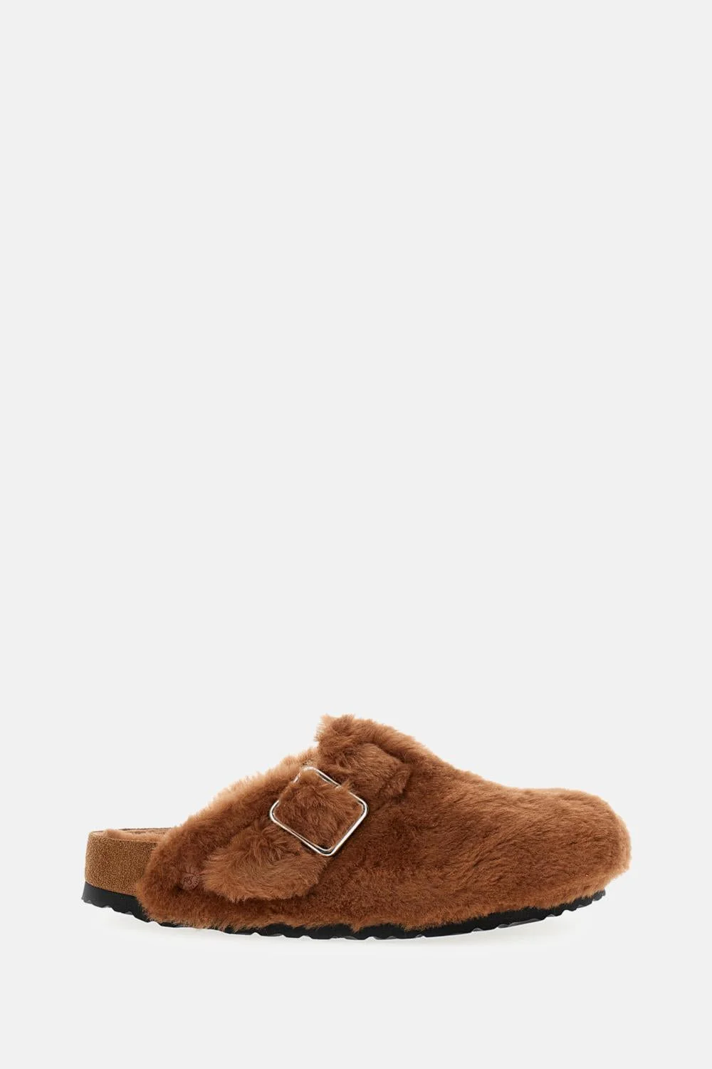 Upper: suede / suede leather + lamb shearling Fully shearling-lined interior Anatomical cork and latex footbed, covered in shearling; outer edges in suede leather Closure: adjustable strap with metal buckle engraved with logo Fit: true to standard Birkenstock size ("true to size") Details and Care Color: Marrone Composition: 100% SHEARLING Made in: Spagna Sku: 1031355CARAMEL