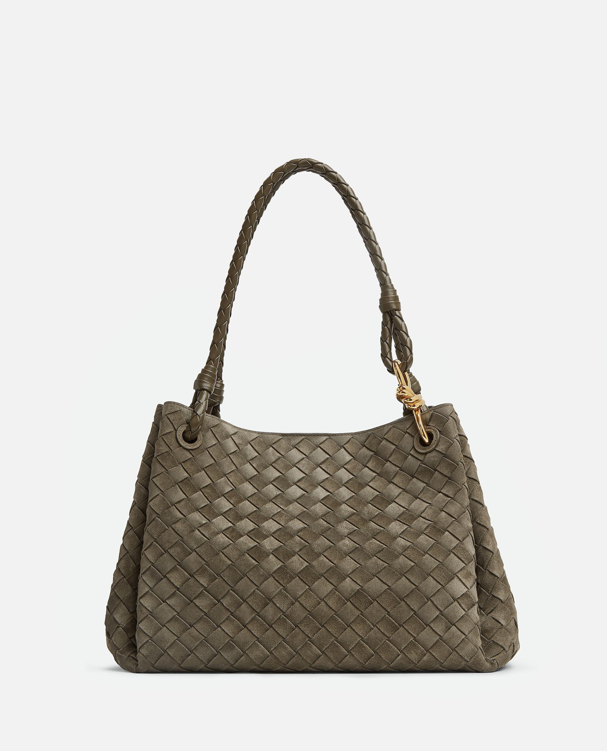 Large parachute leather bag with braiding Gold knot detail Double handles Color: khaki Care and details Color: Green Composition: 100% CALFSKIN LEATHER Made in: Italia Code: 805090V1QE93230