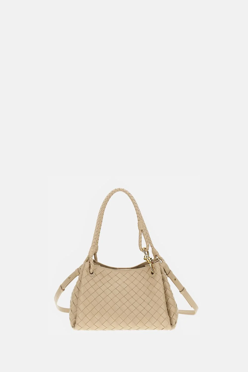 Leather shoulder bag with Intrecciato motif and removable strap. Single main compartment with magnetic tab closure. Lambskin-lined interior with Intrecciato motif. Brass hardware. beige color. Made in Italy. Care and details Color: Beige Composition: 100% LAMBSKIN LEATHER Made in: Italia Code: 835921VCPPT9614