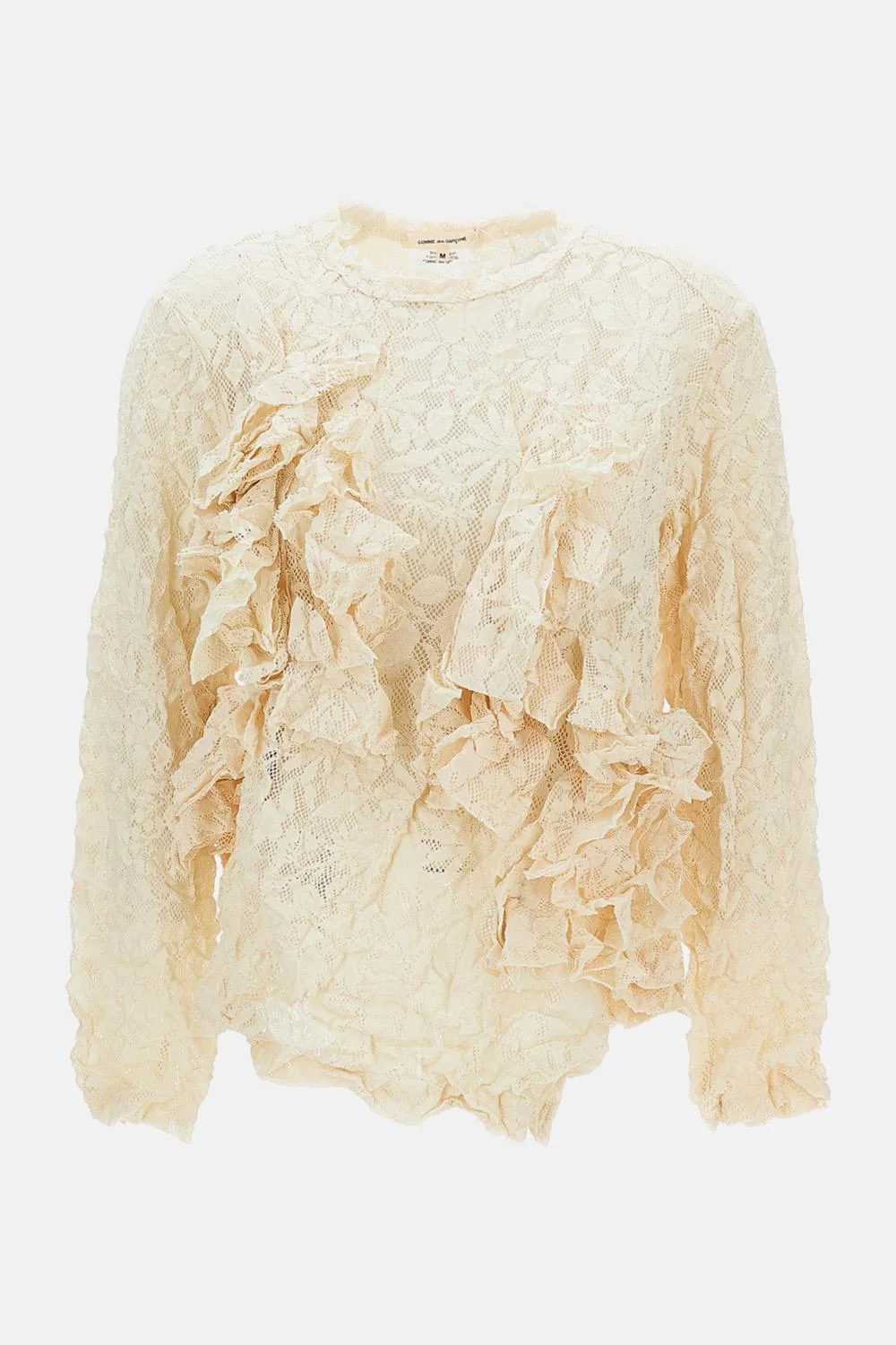 Crew-neck top with long sleeves Asymmetric hem Crinkled-effect lace Ruffle detail at the front Color: white Details and Care Color: Bianco Composition: 100% PL Made in: Giappone Sku: GQT0200511