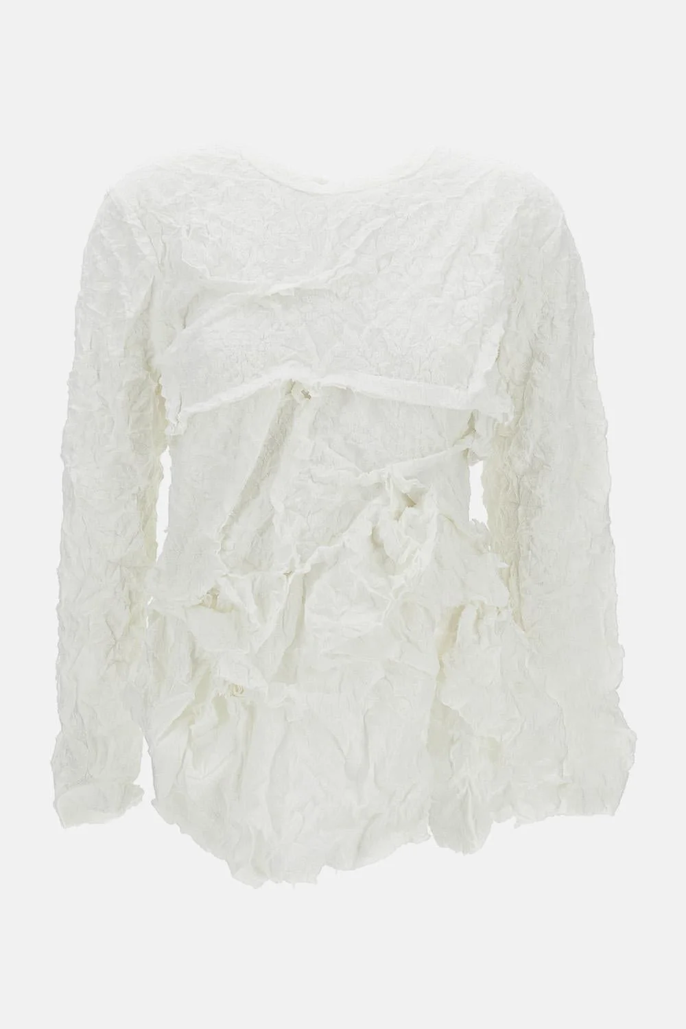 Crew-neck top with long sleeves Asymmetric Structured fabric with a crinkled effect Ruffle detail Color: white Details and Care Color: Bianco Composition: 100% PL Made in: Giappine Sku: GQT0190511