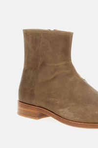 Low ankle boot with side zip closure, crafted from waxed leather with leather and rubber sole, featuring a rounded toe. Color: light brown, visible stitching., made in Italy. Details and Care Color: Beige Composition: 100% SUEDE LEATEHR Made in: Italia Sku: 25230240
