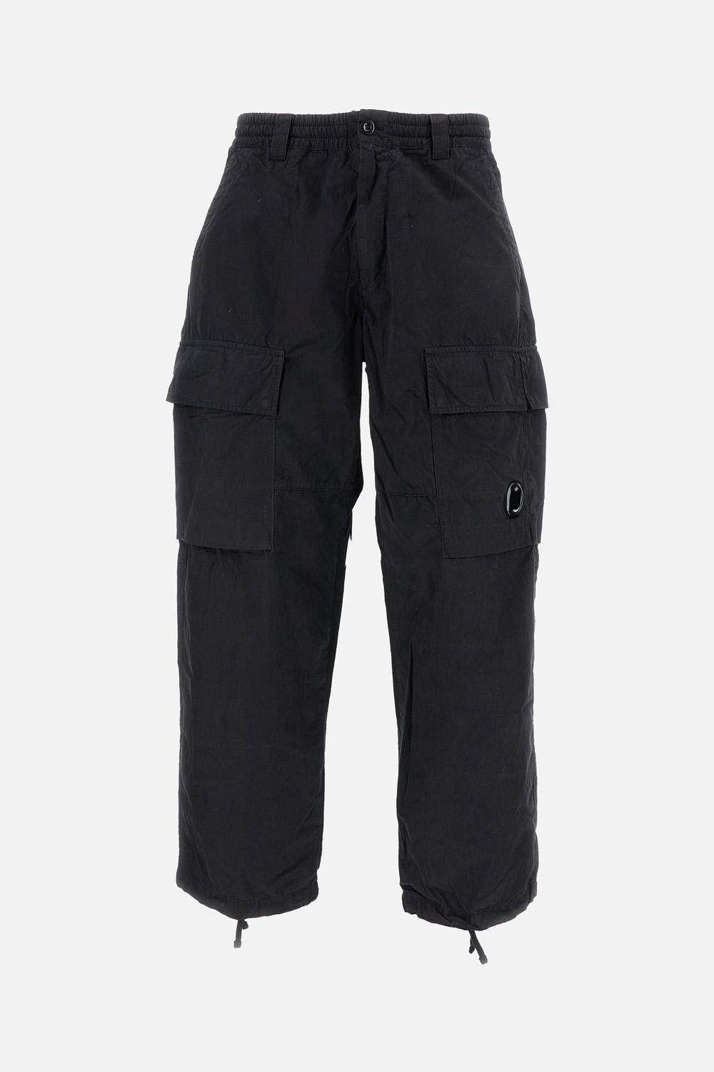 Loose Fit silhouette. Two cargo pockets, one with Lens C.P. Company detail. Belt loops. Zip and button closure. Made of compact rep nylon, durable and water-repellent. Matte surface. Black color. Details and Care Color: Nero Composition: 100% CO Made in: Tunisia Sku: 19CMPA066A110324G999