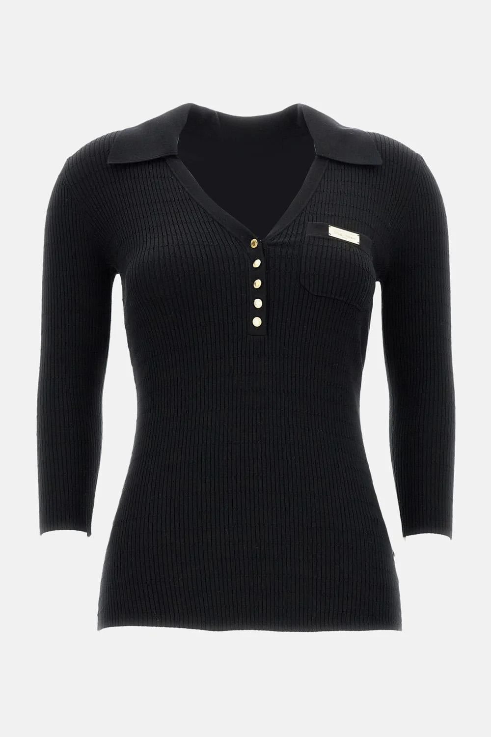Sweater with wide V-neck Buttons on the front Ribbed Gold details Details and Care Color: Nero Composition: 64% LY 20% PA 16% SE Made in: Cina Sku: MK86B61E2110