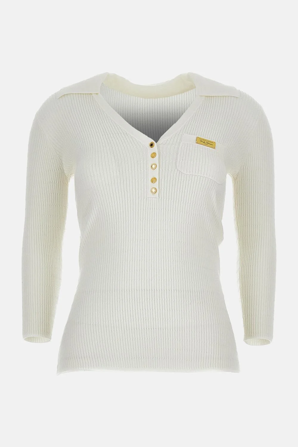 Sweater with wide V-neck Buttons on the front Ribbed Gold details Details and Care Color: Bianco Composition: 64% LY 20% PA 16% SE Made in: Cina Sku: MK86B61E2360