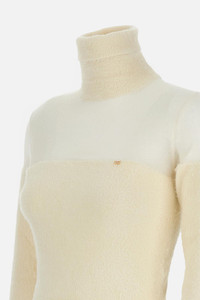 Turtleneck sweater with faux fur effect knit and semi-transparent brushed insert on the shoulders, front jewel metal logo, cropped model, slim fit, folded high collar, long sleeve with cuff. Color: butter; made in Italy. Details and Care Color: White Composition: 83% PA 17% CO Made in: Italia Sku: MK54T57E2DZ9
