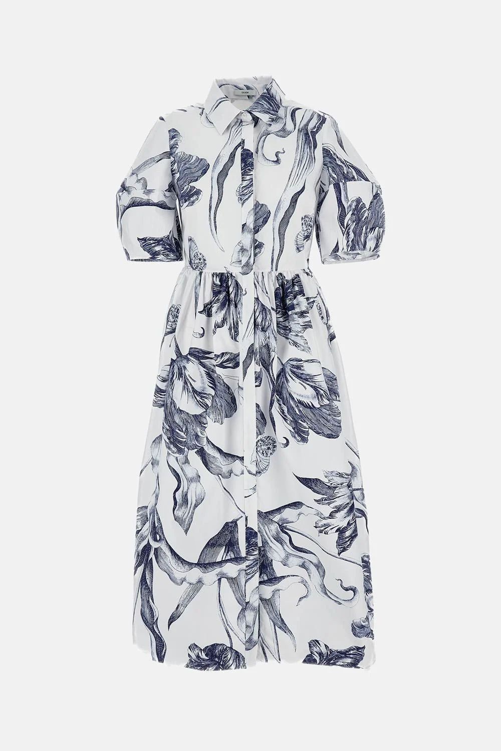 Balloon-line shirt dress with short sleeves. Hidden front button closure. Short puff sleeve. Made of lightweight poplin cotton, with a graphic floral print. Details and Care Color: Bianco Composition: 100% CO Made in: Moldavia Sku: PS26D19851069002BOTANICAL
