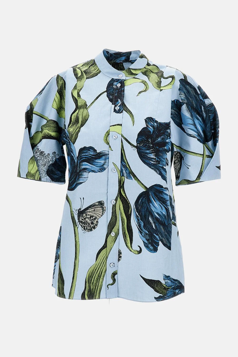 Poplin Cotton Shirt Unique Design: Print inspired by the drawings of Maria Sibylla Merian featuring large tulips and butterflies. Light and fresh powder blue poplin cotton. Classic fit Key Details: Mandarin collar and structured short sleeves. Closure: Visible front buttons. Details and Care Color: Light Blue Composition: 100% CO Made in: Moldavia Sku: PS26T6351074015ETCHEDTULIP