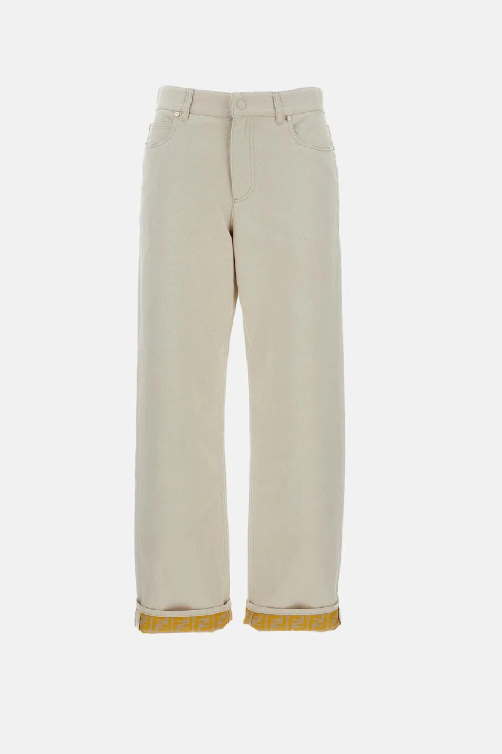 Straight-leg jeans in cotton and linen Relaxed fit Classic five-pocket design Inner with FF motif print Zip and rivet button fastening Brown leather back strap with FF Selleria detail Color: beige Made in Italy Details and Care Color: Beige Composition: 68% CO 32% LI Made in: Italia Sku: FLP882AOHVF1W0T