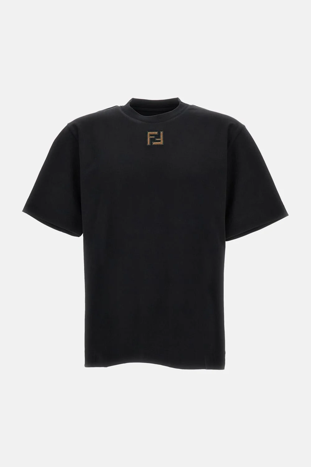 Fendi regular fit T-shirt with round neck and short sleeves. Material: 100% black cotton. Iconic detail: brown corduroy micro FF pattern applied on the front. Design: classic and versatile cut. Made in Italy. Details and Care Color: Nero Composition: 100% CO Made in: Italia Sku: FY0936AW0RF1UL6